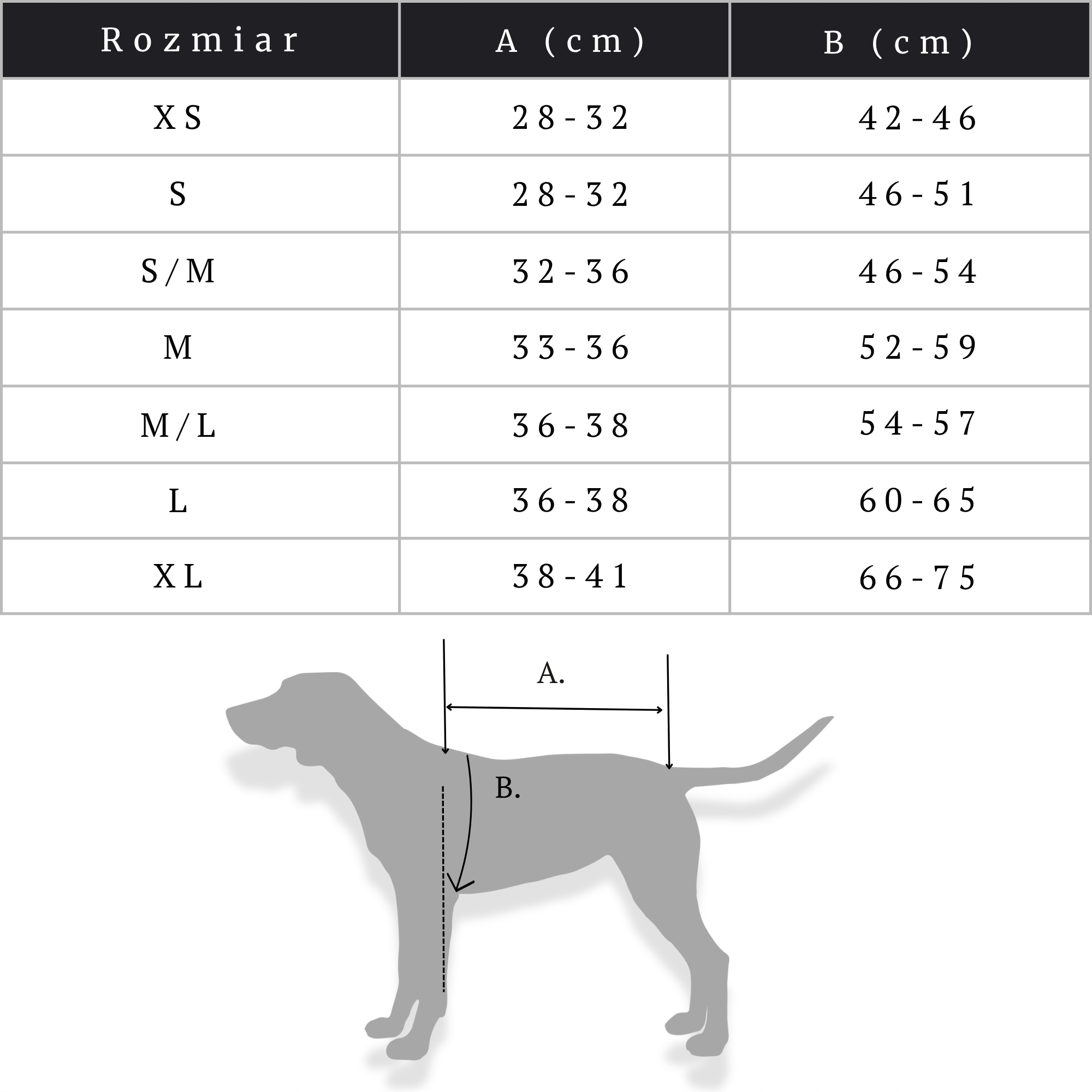 розмір L -chest об'єм 60-65 см, довжина спини від лопатей до хвоста 36-38 см. Скриня 67-75 см, довжина спини від лопатей до хвоста 38-41 см.