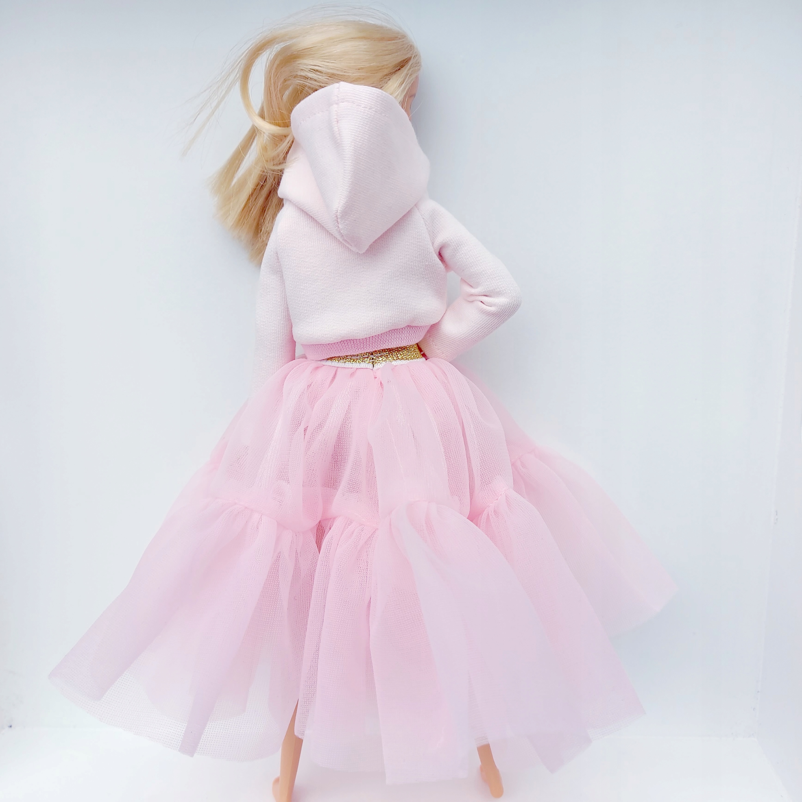 - рожева спідниця з щільно м’ятого фатину типу пачка на золотистій блискучій гумці, що полегшує одягання