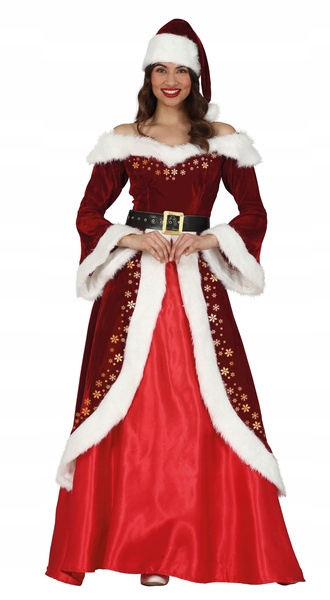 Червона сукня з довгим рукавом, виконана з матеріалу, що імітує оксамит, і матеріалу, що імітує шовк. Оздоблення білим матеріалом.