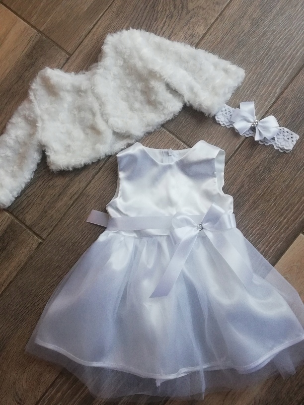 Гарна атласна сукня на широких бретельках. Низ виконаний з декількох шарів м'якого фатину, завдяки чому сукня виглядає ефектно. Підв'язується на талії поясом з білим бантом ручної роботи. Застібається ззаду на довгу закриту блискавку, що полегшує одягання маленької принцеси. Пояс дозволить сукні ідеально сидіти. Доповніть красиве біле болеро з крихітними трояндами та м’якою мереживною пов’язкою.