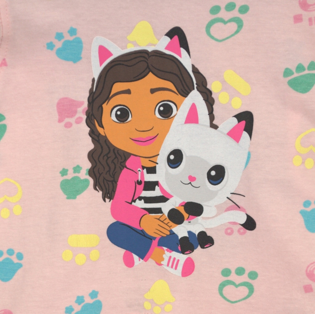 бавовняне плаття Koci Gabi House для світло -рожевої дівчини з рукавом у вигляді бурхливої. На передніх сукнях з Габі та кошеня. Сукня -спідниця -сукня з друком барвистих дизайнів. Нове плаття з ліцензією з набором тегів. Зроблено 100% бавовняне, приємне повітряне плаття на літні дні.