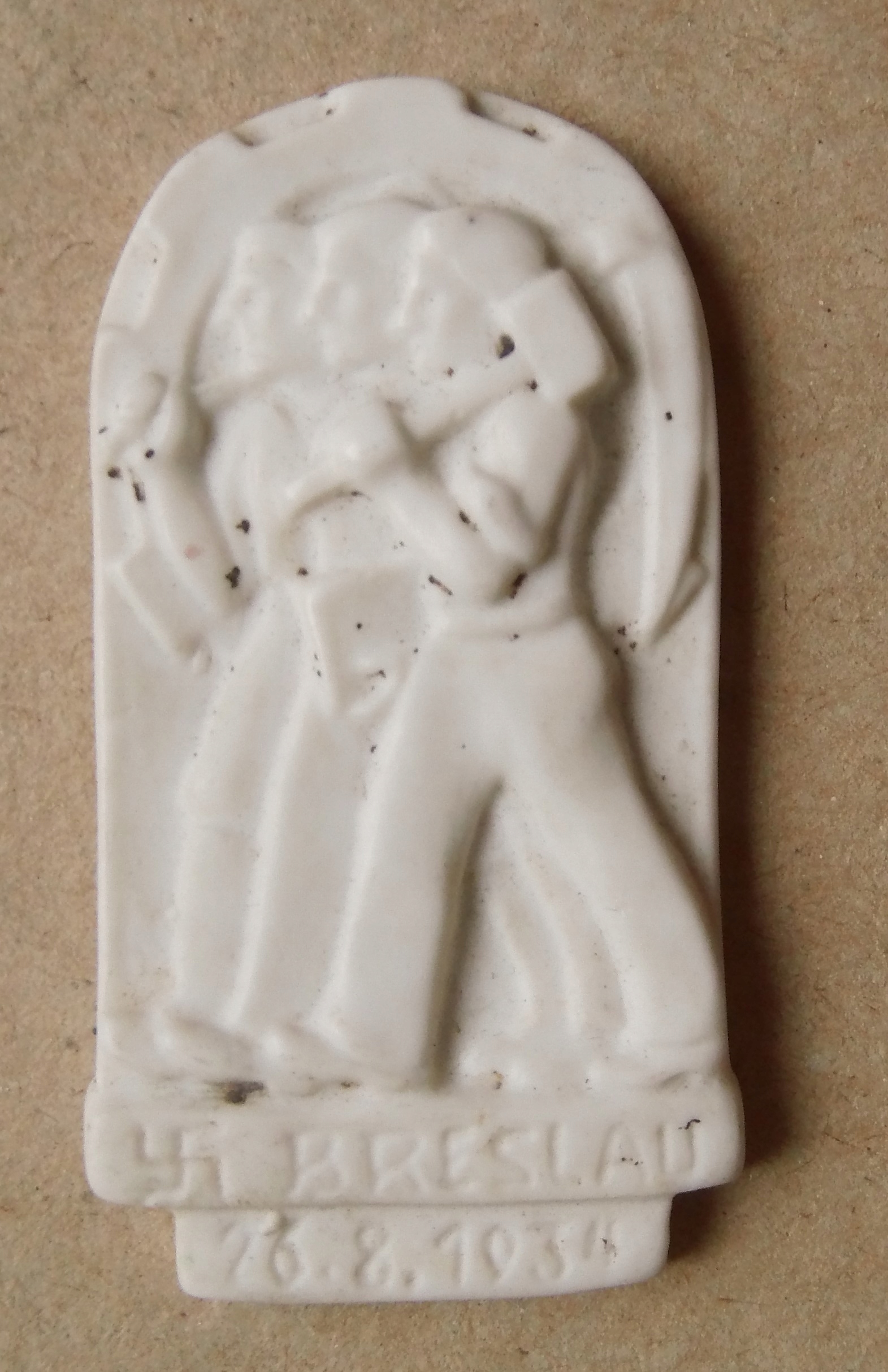Оригінальний порцеляновий нацистський пам'ятний значок на честь пропагандистського маршу членів DAF у Вроцлаві 26 серпня 1934 року (звичайно під патронатом NSDAP).