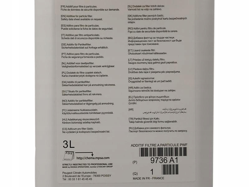 Добавку Eolys Powerflex ні в якому разі не можна змішувати з Eolys DPX42, Eolys 176 або Infineum F7995. Розроблено спеціально для автомобілів з дизельними двигунами, оснащеними фільтром твердих частинок (FAP), починаючи з OPR 12152 або 12166 (див. посібник B1KT0102P0 для детального списку автомобілів). Колір маркування роз'єму Snap-in на автомобілі та штекерів GT Kit; блакитний. Одноразове використання: Викиньте засіб після використання, щоб уникнути будь-якого забруднення системи допінгу. Забезпечує повне згоряння викинутих частинок сажі двигун. 3-літровий набір дозволяє робити заправки під час втручань. Ці рідини забезпечують безпеку вашого автомобіля. Кожне покоління присадок складається спеціально для конкретного типу двигуна.