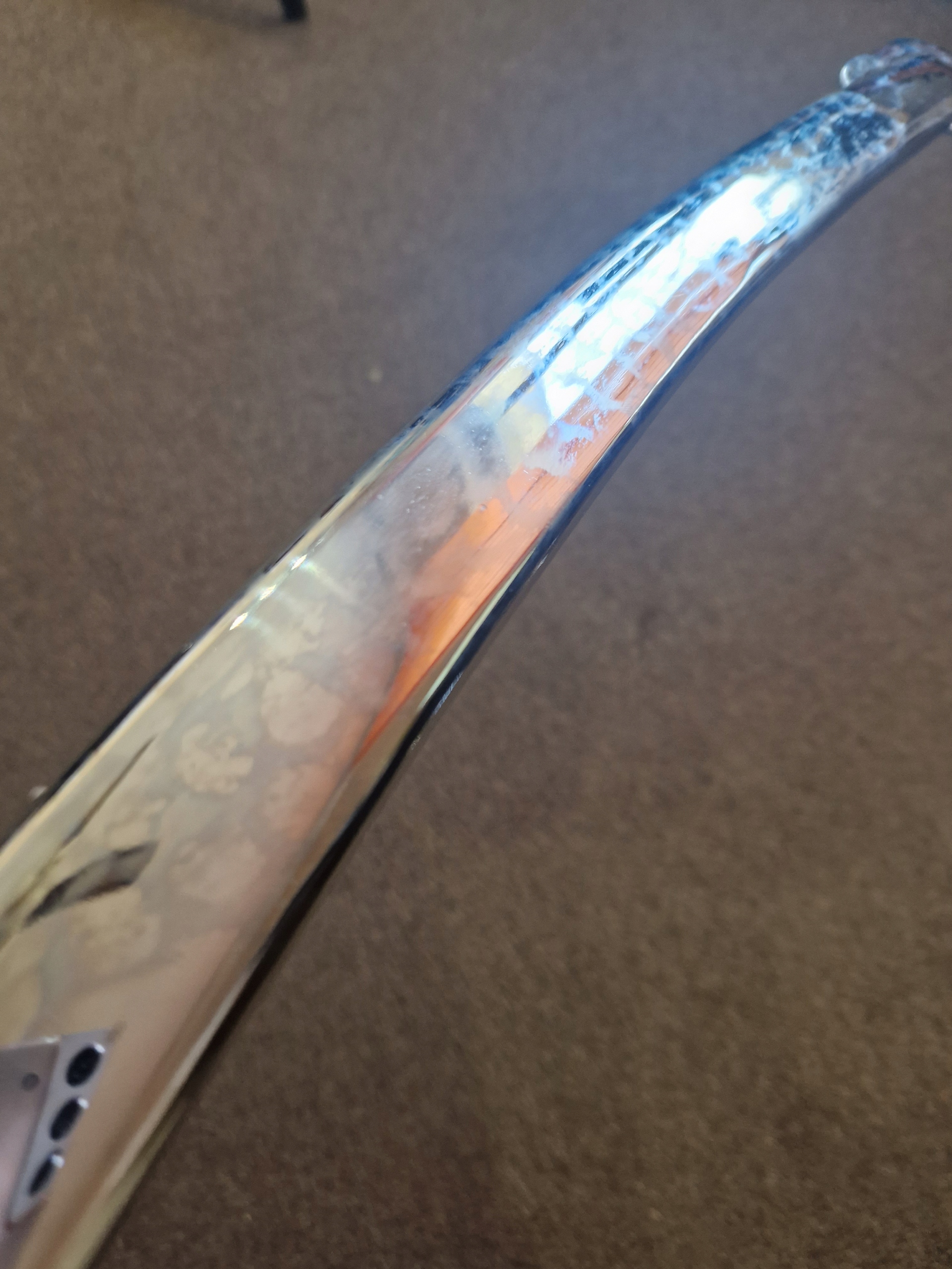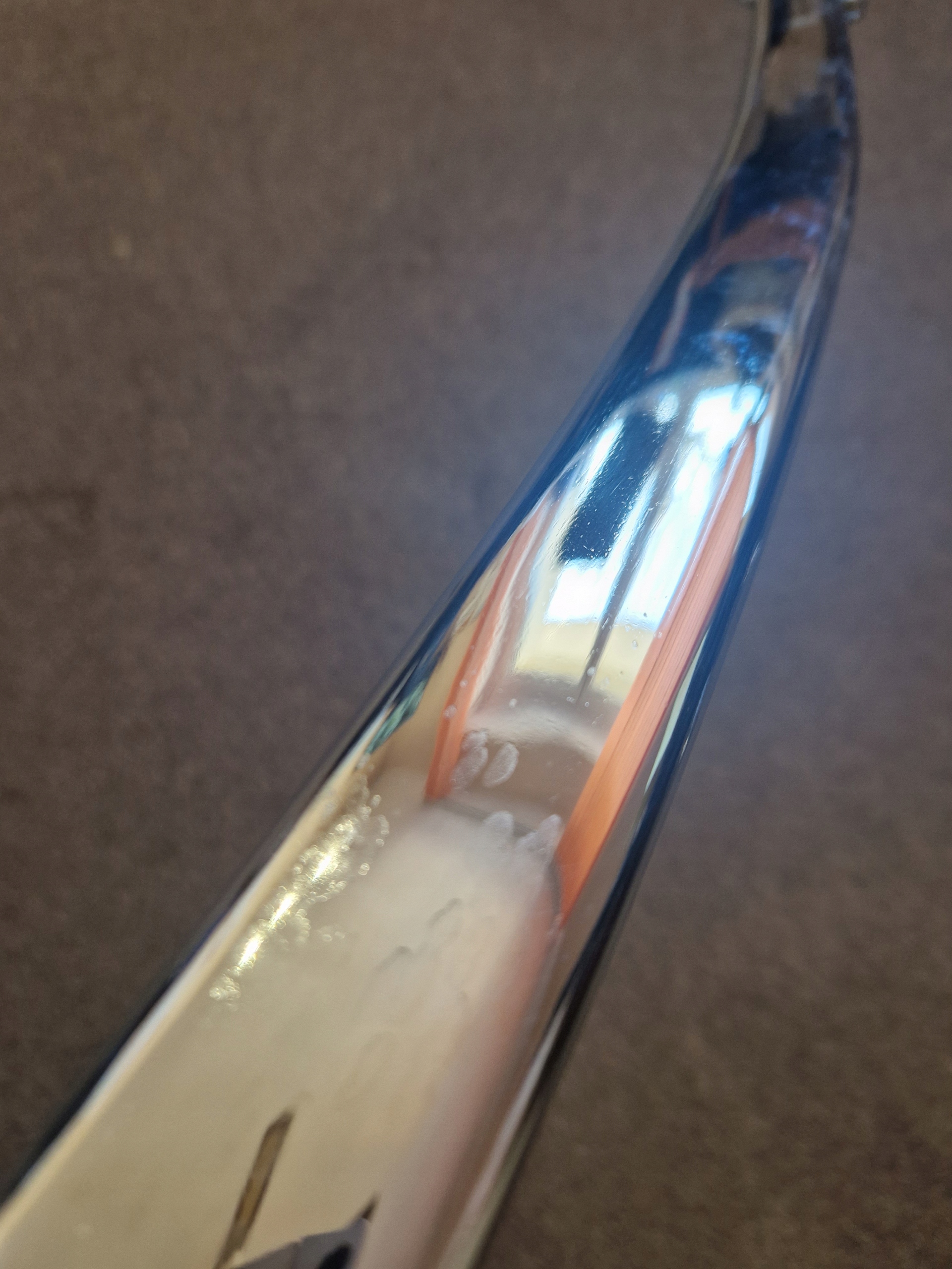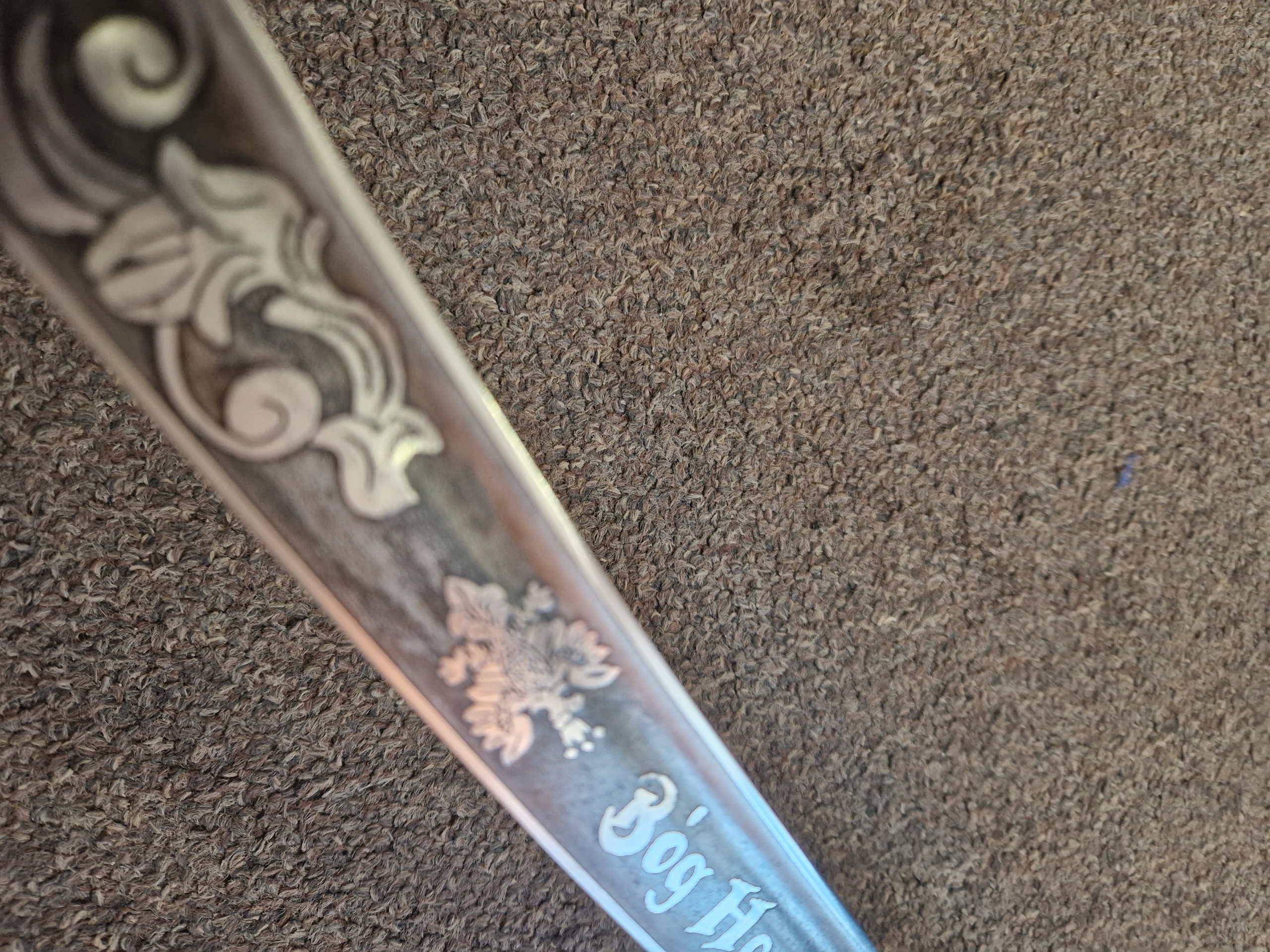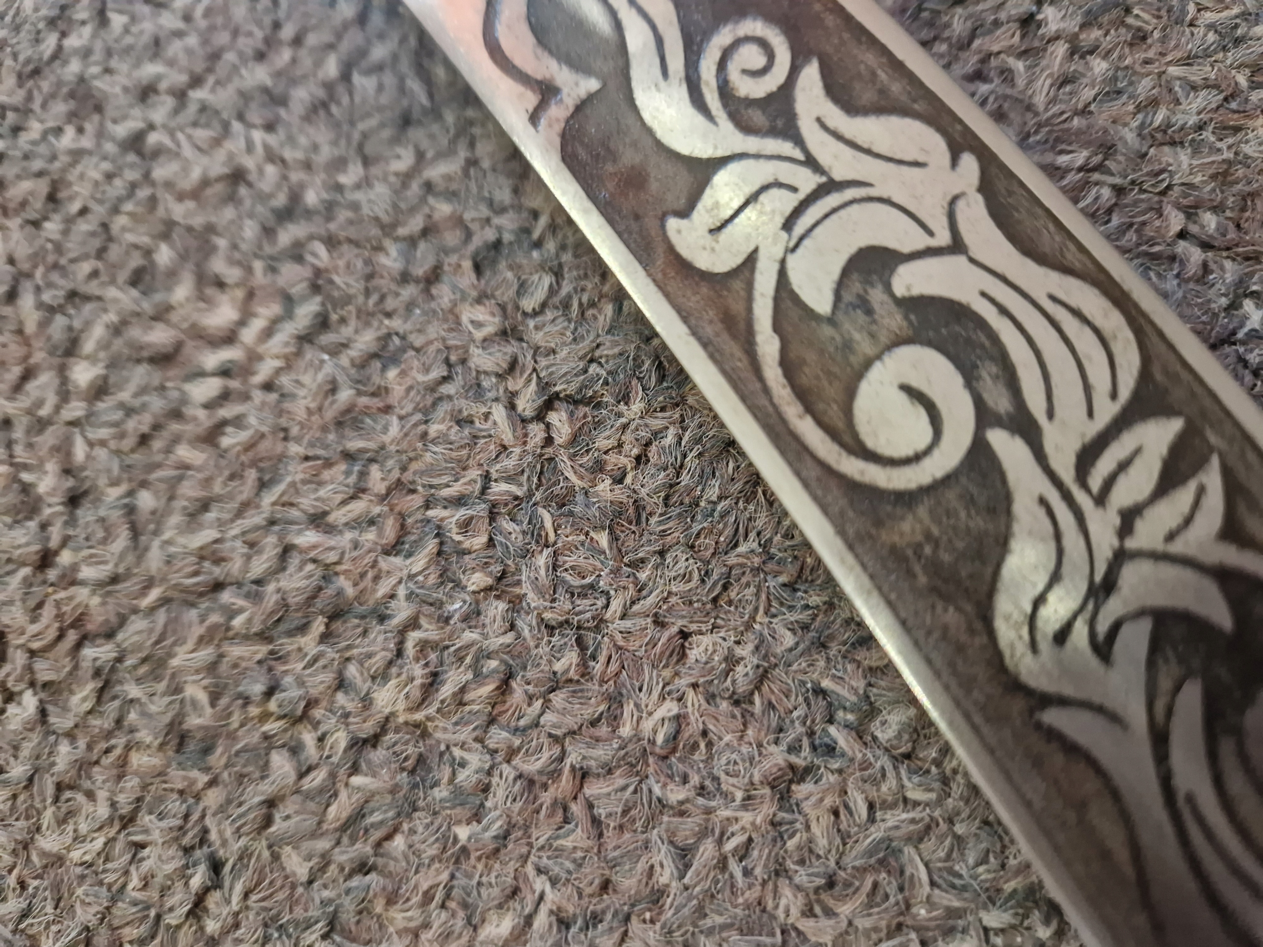 Плоске лезо, вигнуте рослинним орнаментом на заставу та на гравюрі. Повністю закритий, із золотим джинтером і вусами у вигляді забарвленої струни.