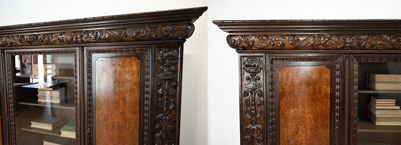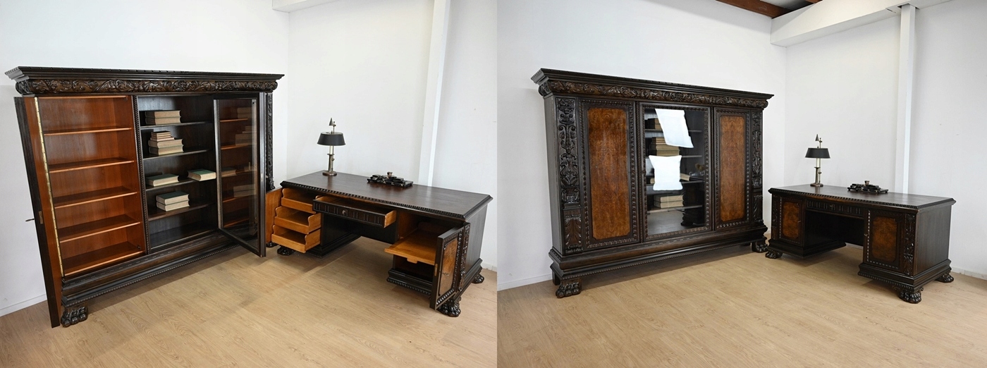 Дуже хороший стан. Меблі, підготовлені до використання. Зовнішні поверхні та меблеві вироби були оновлені. Меблі вже мають свої роки та сліди минулого часу, які не впливають на їх естетичний прийом, вони є свідченням справжності меблів. Офіс можна відразу помістити в квартиру.