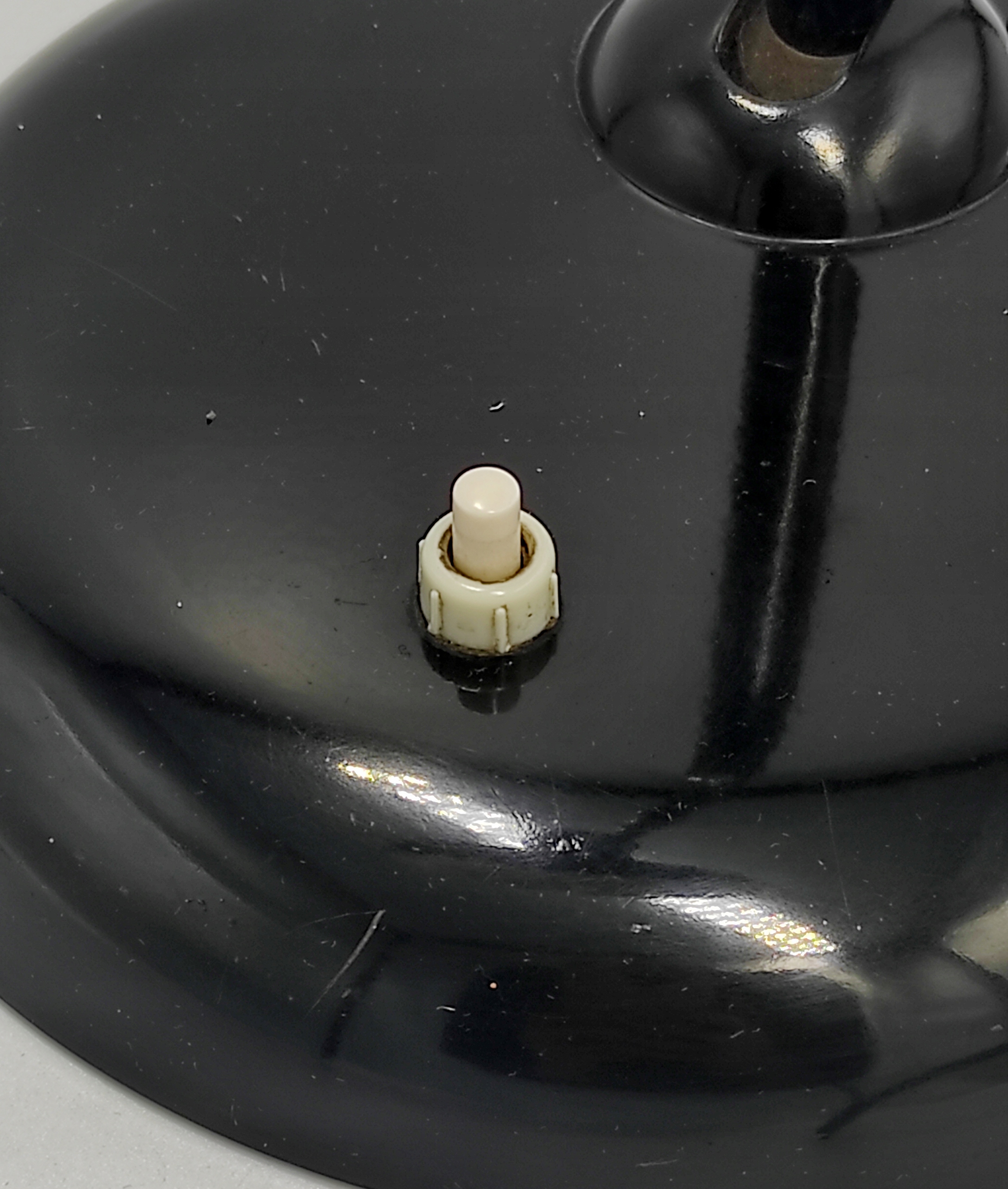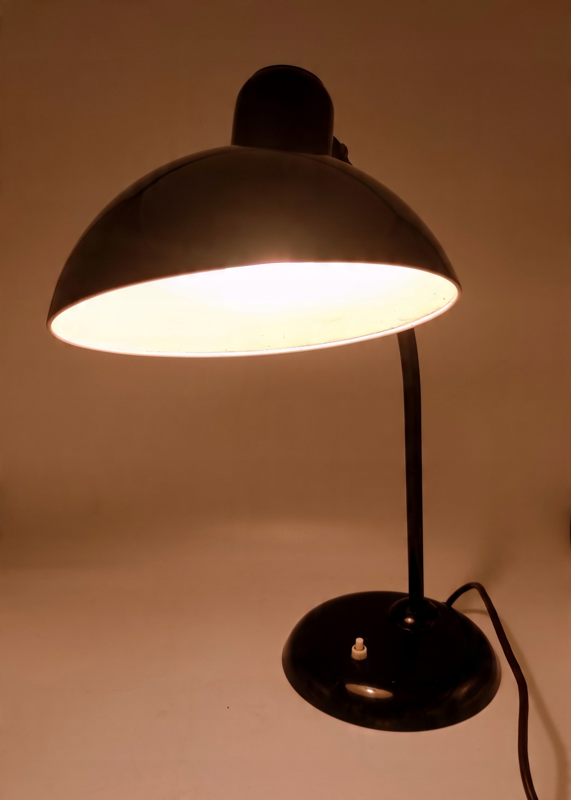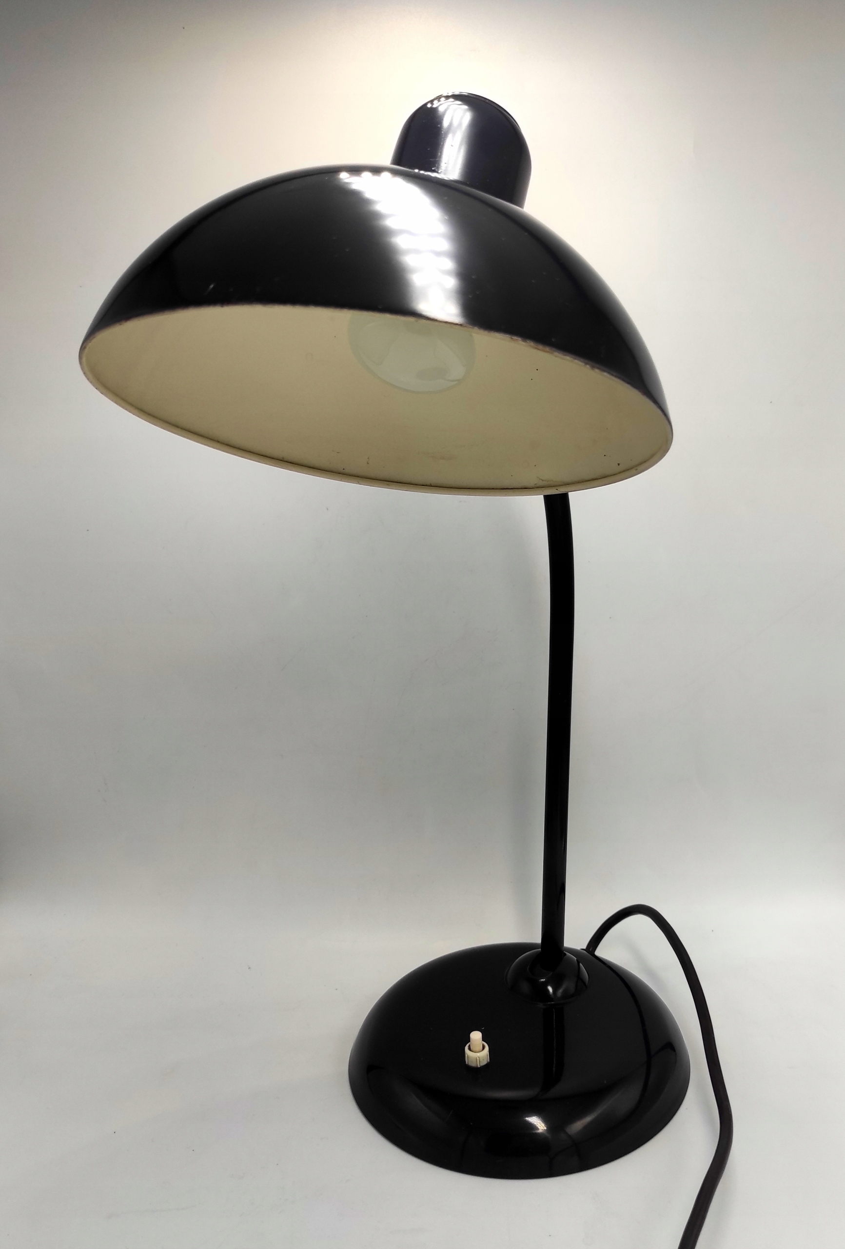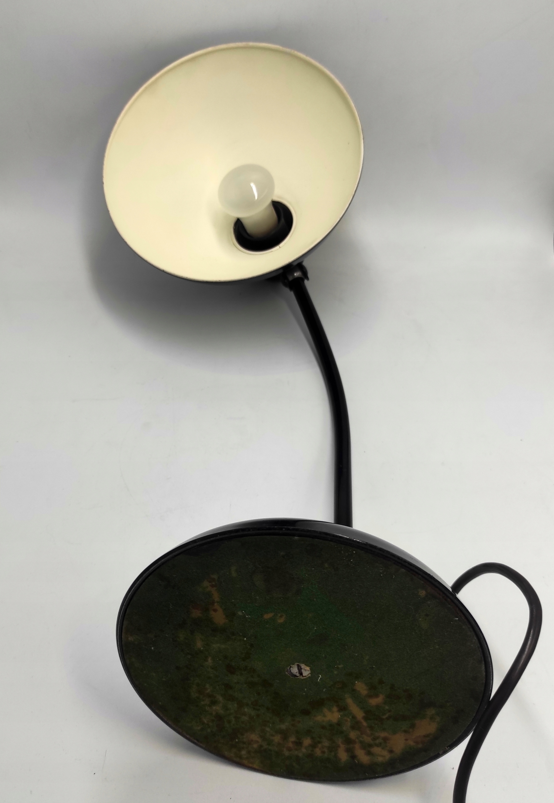 Стан продукту, враховуючи його вік, вважається хорошим . Лампа повністю справна і не потребує серйозних консерваційних робіт. Єдине видиме пошкодження - невеликі подряпини на поверхні основи та абажура, як зверху, так і знизу, а також більша подряпина, яка видна на фото. Щиро запрошуємо всіх шанувальників мінімалізму та індустріального стилю, що походить від Баухаузу, до покупки. Світильник може стати дизайнерською прикрасою столу або кабінету. Вінтажні лампи Kaiser Idell - справжня рідкість на колекційному ринку.