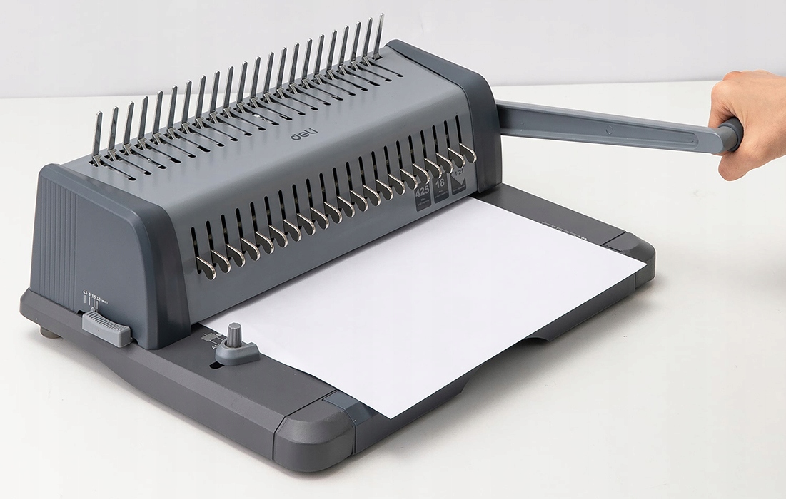Палітурна машина Deli E3873 дозволяє скріплювати аркуші паперу до формату A4. Використовуючи його, ви можете зробити від 1 до 21 отвори в 18 аркушах паперу одночасно. Також є можливість регулювати поля. Пристрій дозволяє скріпити до425 аркушів паперу. Він оснащений спеціальним резервуаром для відходів і неймовірно простий у використанні.