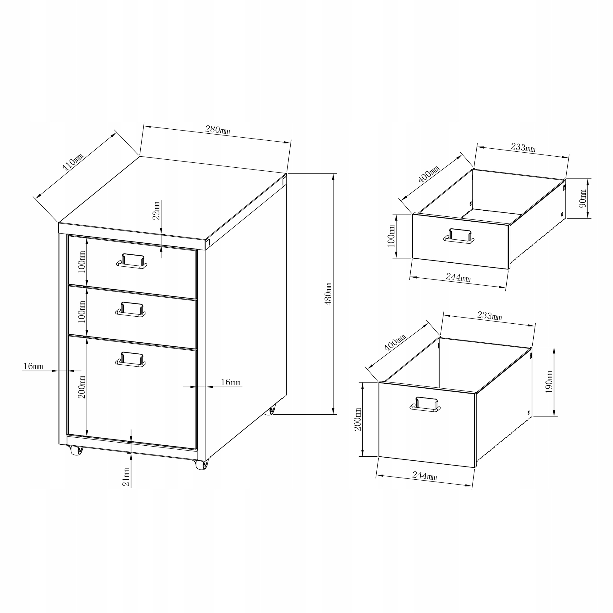 - Внутрішні розміри великої шухляди (В x Ш x Г): 19 x 23,3 x 40 см