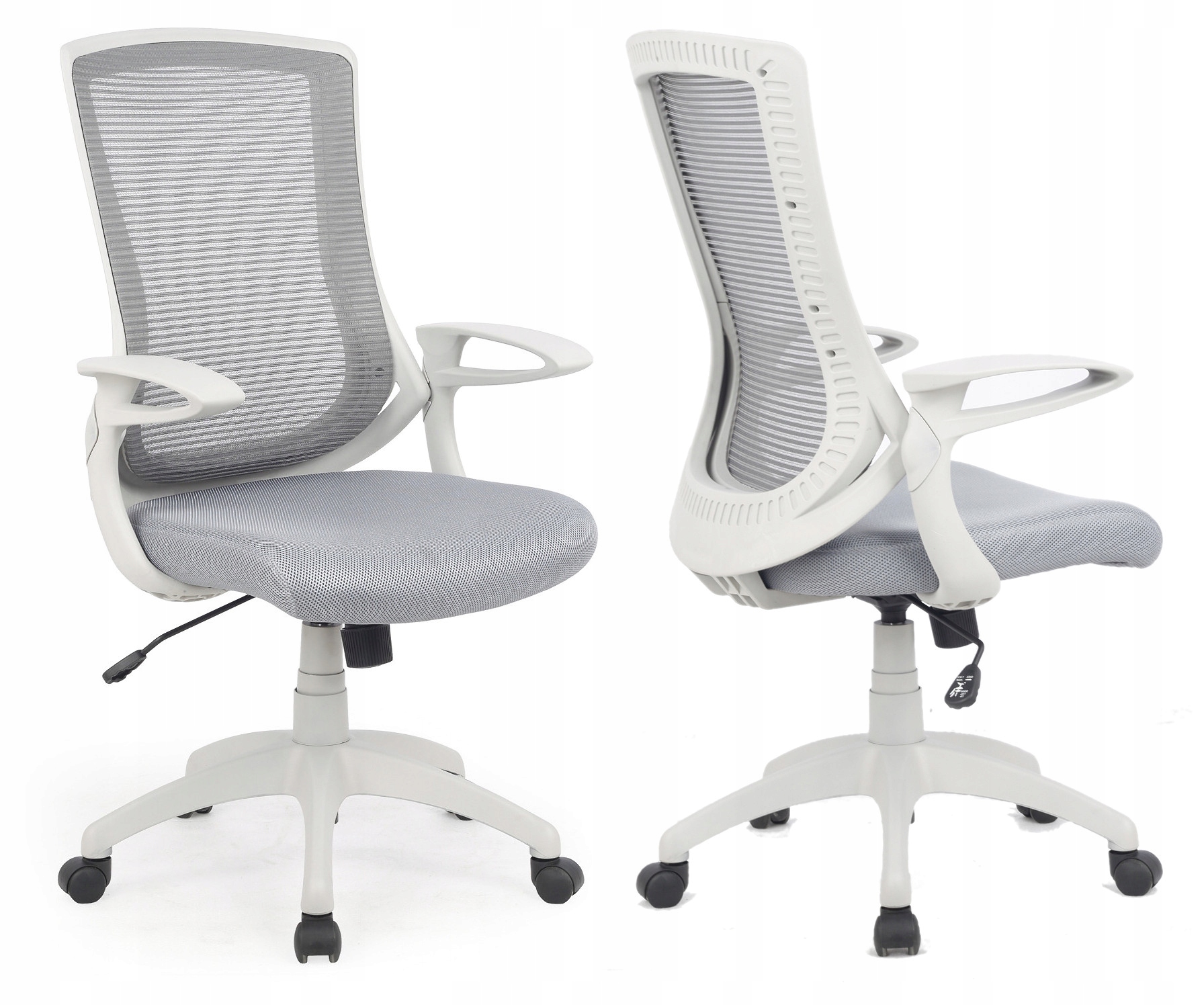 Привабливе офісне крісло, що обертається. Бігова основа і підлокітники виготовлені з міцного білого пластику (він не ідеально білий, його також можна охарактеризувати як світло-сірий). Сітчаста спинка і сидіння, оббиті мембранною тканиною, дозволять шкірі користувача повноцінно дихати. Сіра оббивка.