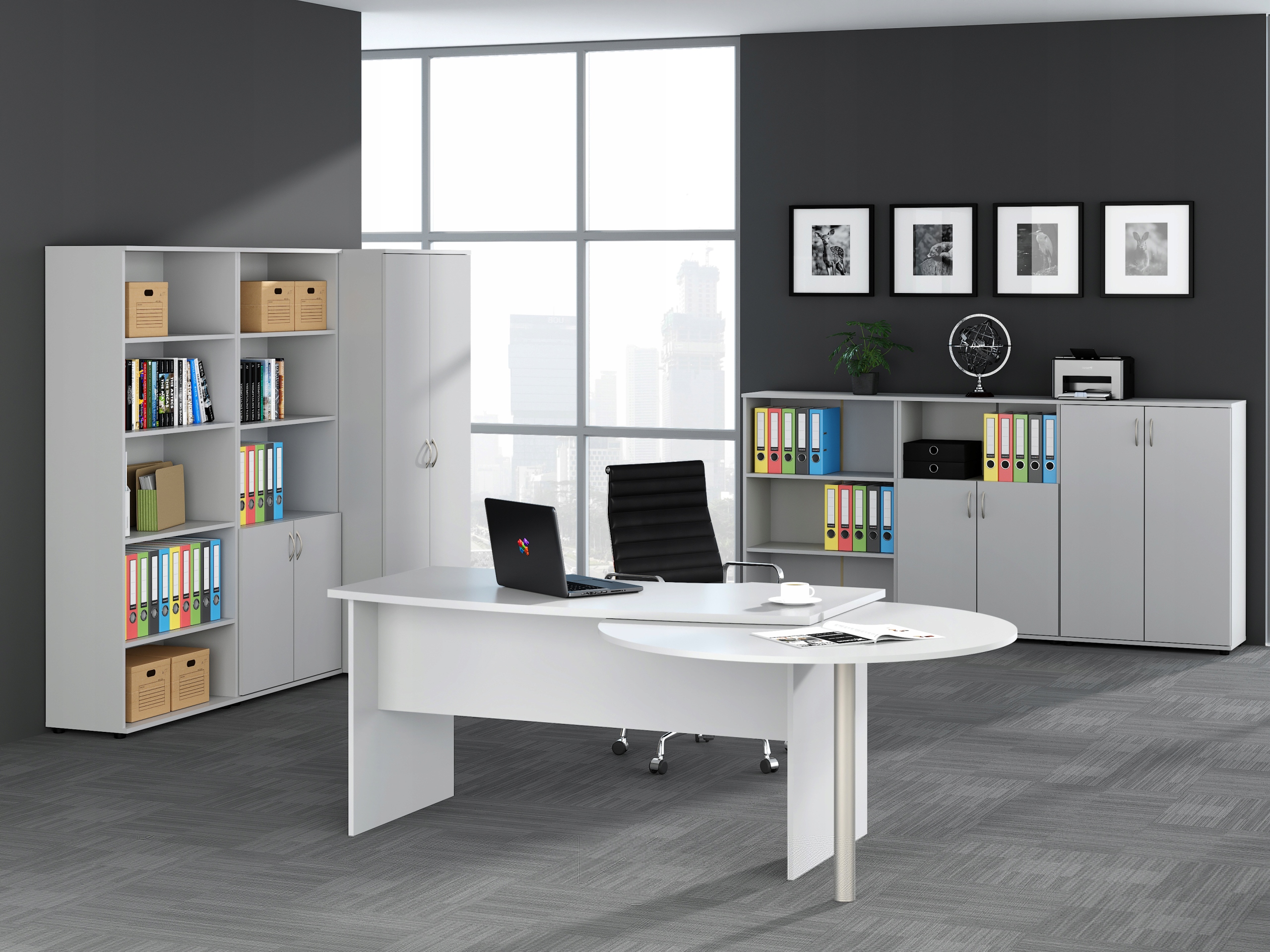 Офісна система характеризується високою функціональністю та естетичністю. Меблі виготовлені з високоякісних матеріалів як польських, так і іноземних виробників. Для виготовлення офісних меблів ми використовуємо ламіновану меблеву плиту товщиною 18 мм і 25 мм (для стільниць). Краї елементів покриті АБС-кантом товщиною 0,5 мм і 2 мм у випадку стільниці відповідно.