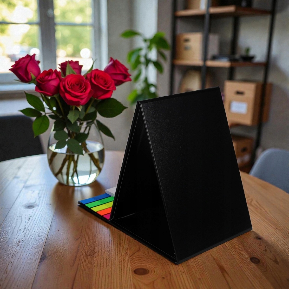 Стійка підставка з елегантним шкіряним шпоном дозволяє розмістити календар на столі. Блокнот із липкими нотатками, який додається до календаря, спрощує робити додаткові нотатки та записувати важливі справи. Записки допоможуть прикріпити записки в зручному місці. Прозорі самоклеючі маркери, що кріпляться до календаря, дозволяють легко відзначити фрагмент тексту або місце в книзі, блокноті або календарі. Маркери та наліпки при необхідності легко відклеїти, не залишаючи слідів на поверхні.
