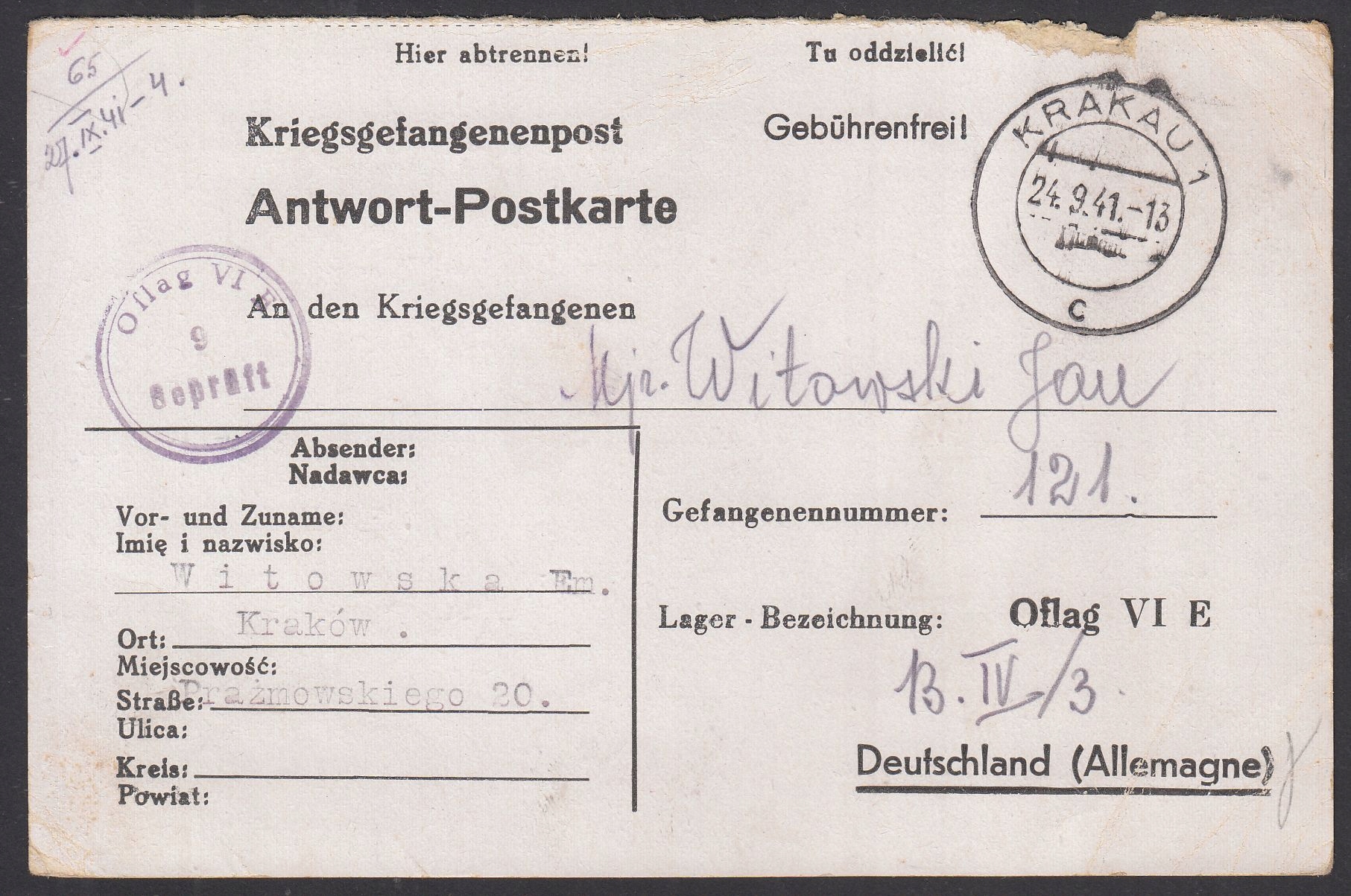 Oflag VIE Dorsten kartka z Krakowa do obozu 1941 (43)