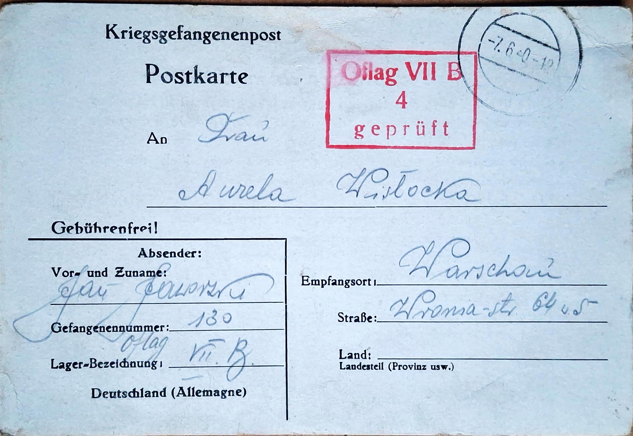 OFLAG VII B - ЛИСТОВА ЛИСТОВА ДО ВАРШАВИ 1940