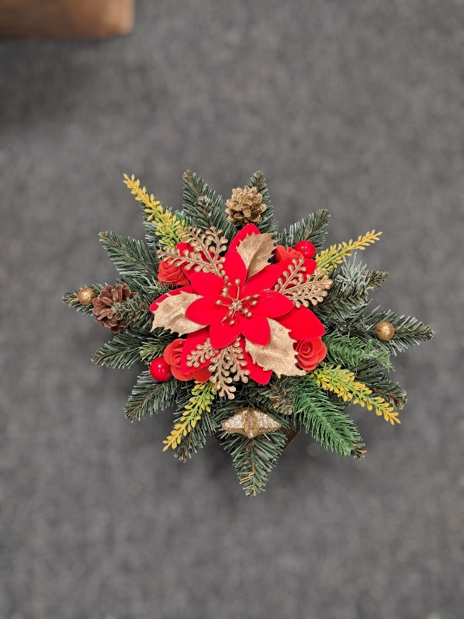 Додатково прикрашений штучними гілками вересу, крихітними дрібничками та сосновими шишками.
