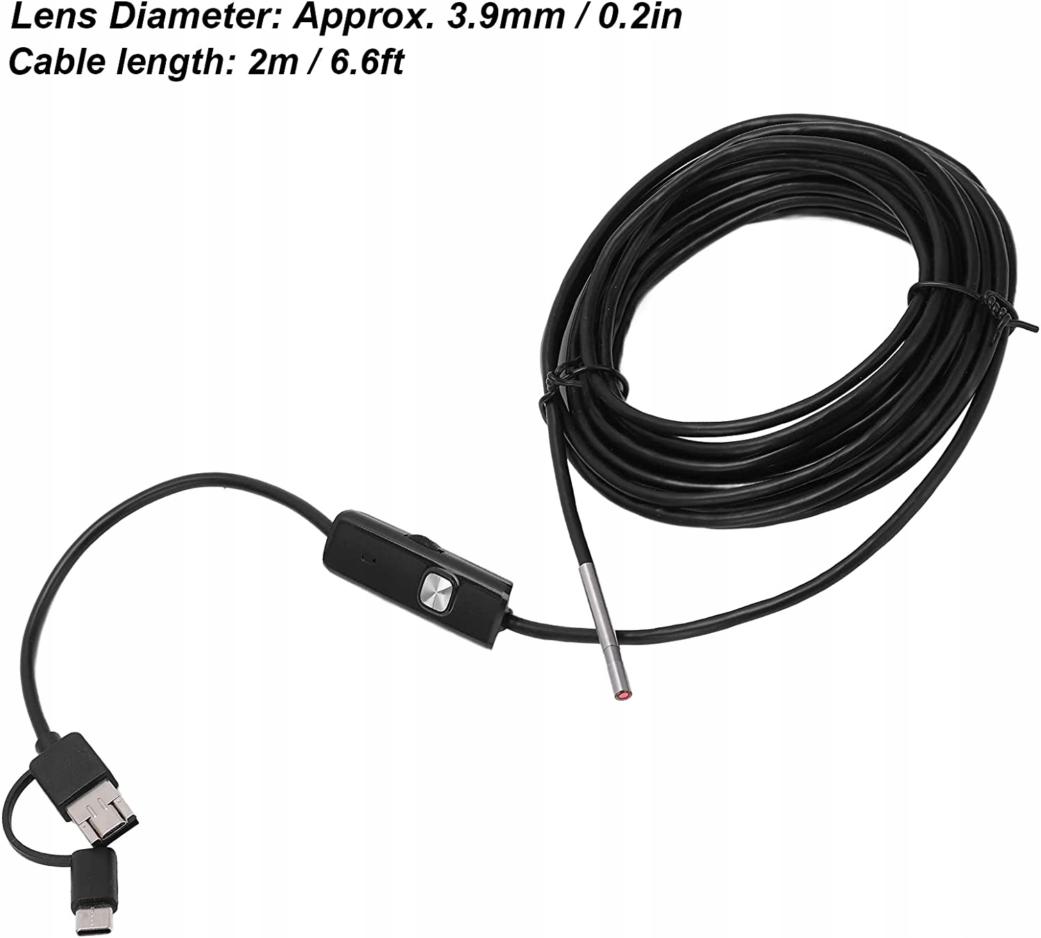 Виріб виготовлено з високоякісного матеріалу ABS, який є стійким до корозії, окислення та міцним. Мобільний телефон можна легко ремонтувати та керувати однією рукою, що дуже зручно та може задовольнити різні потреби. Водонепроникний об’єктив діаметром 39 мм IP67. 6 світлодіодних ламп можна регулювати за допомогою кнопки диммера на блоку керування відповідно до ваших вимог. Цей ендоскоп може зменшити експозицію зображення та колірний ефект у темряві чи при слабкому освітленні без спотворення. Цей продукт широко використовується для технічного обслуговування автомобільних двигунів, технічного обслуговування електрики, дренажу, труб, перевірки машин і візуального огляду важкодоступних місць.
