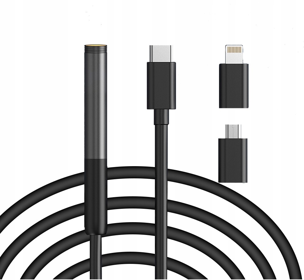 Ендоскоп може працювати зяк з телефони / смартфони та планшети, які мають вихід MicroUSB або USB Type C, Lightning, операційну систему Android і підтримують стандарт OTG або UVC, а після використання адаптера MicroUSB на USB ми можемо підключити ендоскоп до класичних комп’ютерів / ноутбуків / планшетів з портом USB і операційною системою Windows.