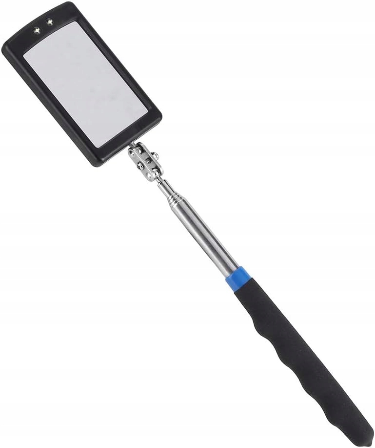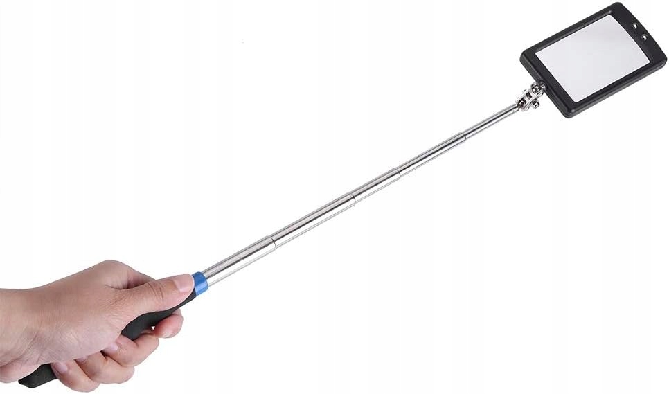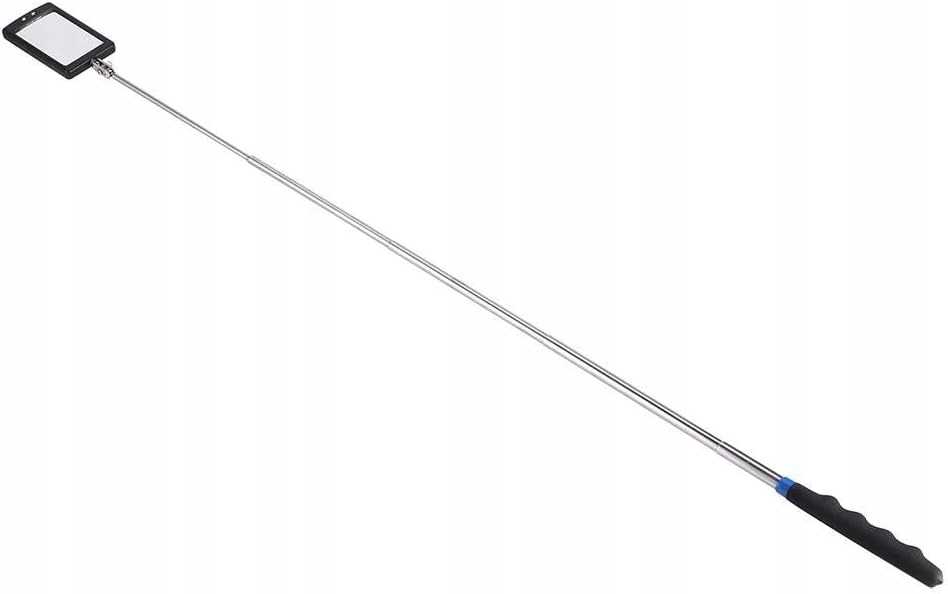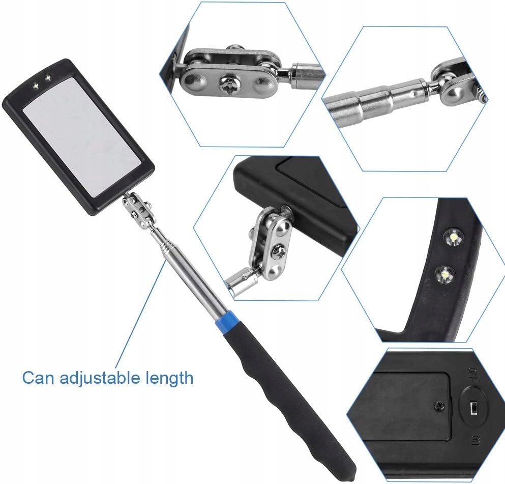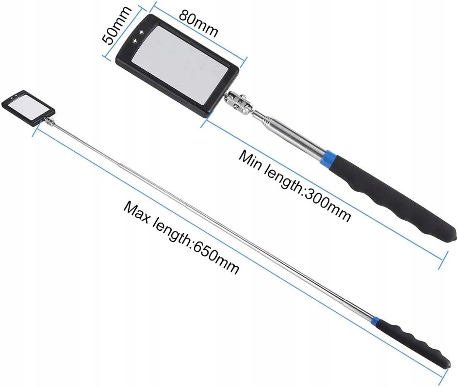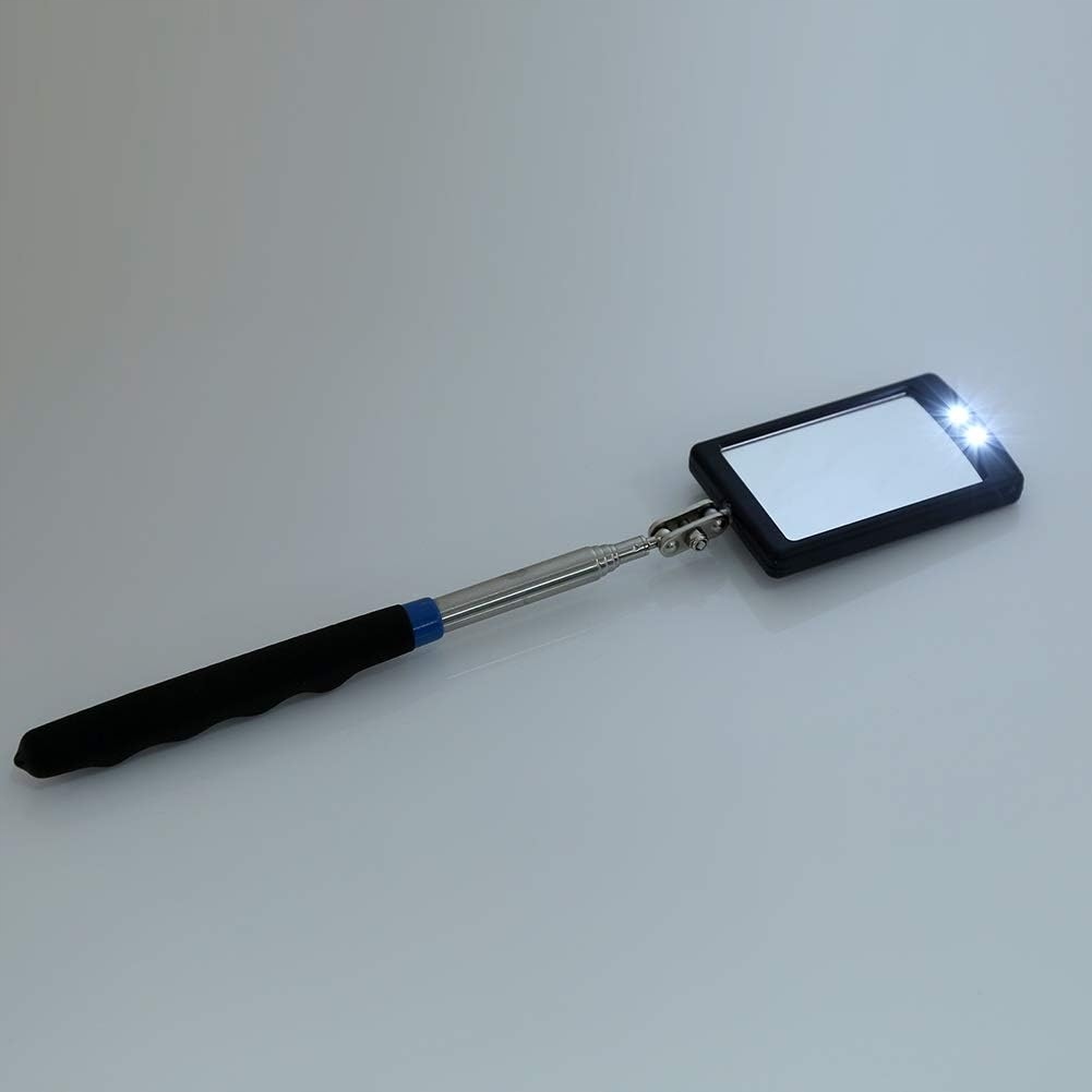 Виготовлений із легованої сталі та твердого АБС-пластику, довговічний і міцний, безпечний і екологічно чистий у використанні. Має 2 дуже яскравих світлодіода, які полегшують огляд важкодоступних і важкодоступних місць в транспорті, машинах і т.д., легко проникаючи в темні щілини робочого простору. Він також має кульовий шарнір, що обертається на 360 градусів, для додаткової можливості перегляду, що дозволяє оглядовому дзеркалу вільно обертатися, зберігаючи потрібне положення. Зручна рукоятка з м’якою нековзкою рукояткою з ABS-пластику, створена для впевненого керування. Довжину можна регулювати відповідно до ситуації. Ідеальний інструмент для інструментів і механіків, механіків і інспекторів, лампа особливо корисна в темних і важкодоступних місцях.