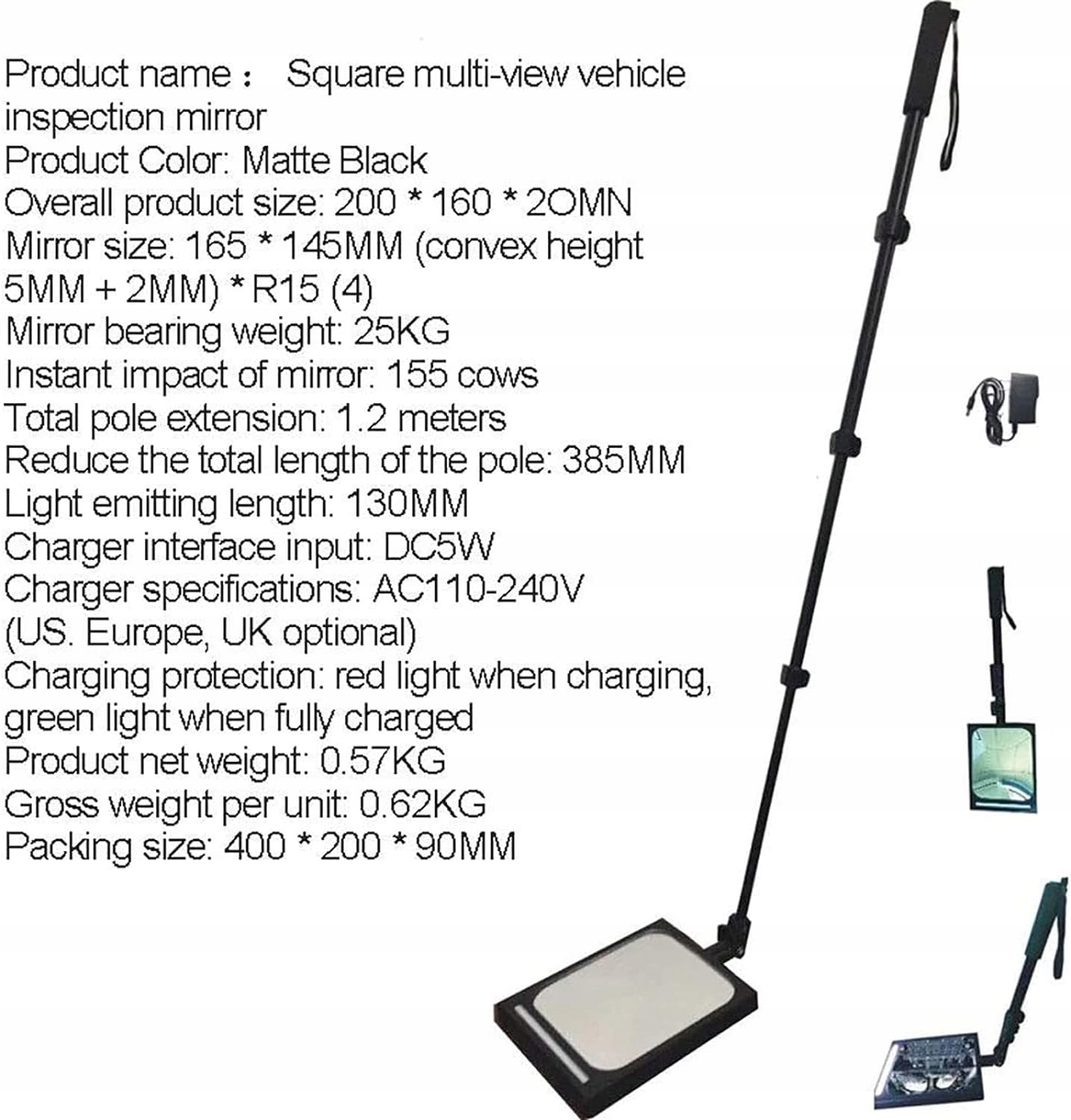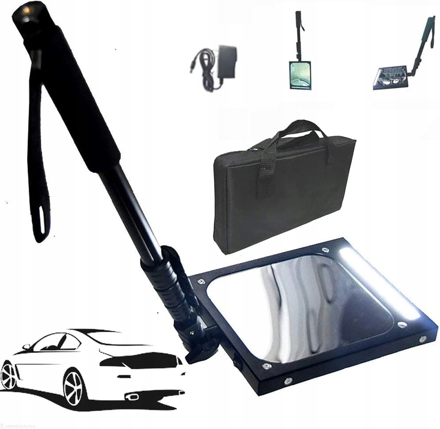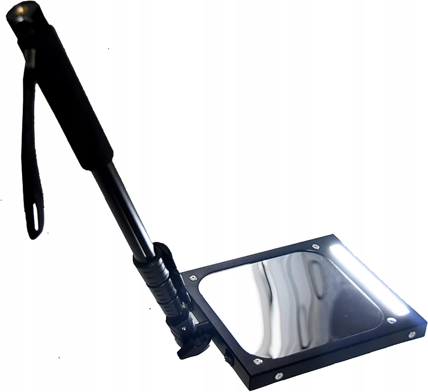 Рамка підлогового оглядового дзеркала виготовлена з високоякісної алюмінієвої конструкції та має високу міцність. висувні і складані. Акрилове дзеркало обертається на 360 градусів для гнучкого використання. Чіткий кут огляду. Світлодіодна високоефективна біла світлодіодна лампа Вночі або при слабкому освітленні ви можете чітко бачити приховані об’єкти, відображені на дзеркалі, не турбуючись про темряву. Зручний і легкий у транспортуванні, довжина телескопічної палиці може досягати 1200 мм фіксованої довжини відповідно до вашого власного використання, яка може проникати глибоко в землю розпізнаного транспортного засобу та виявлених об’єктів. Застосування Оглядові дзеркала є чудовим інструментом для спостереження за днищем автомобілів, машин, вантажівок, шкільних автобусів, поїздів, будівельних машин, промислових установок та інших важкодоступних місць. Широкі сфери застосування До поширених застосувань інспекційних дзеркал належать безпека під’їзду, охорона автостоянок, контроль дорожнього руху, військові контрольно-пропускні пункти та технічне обслуговування автомобілів.