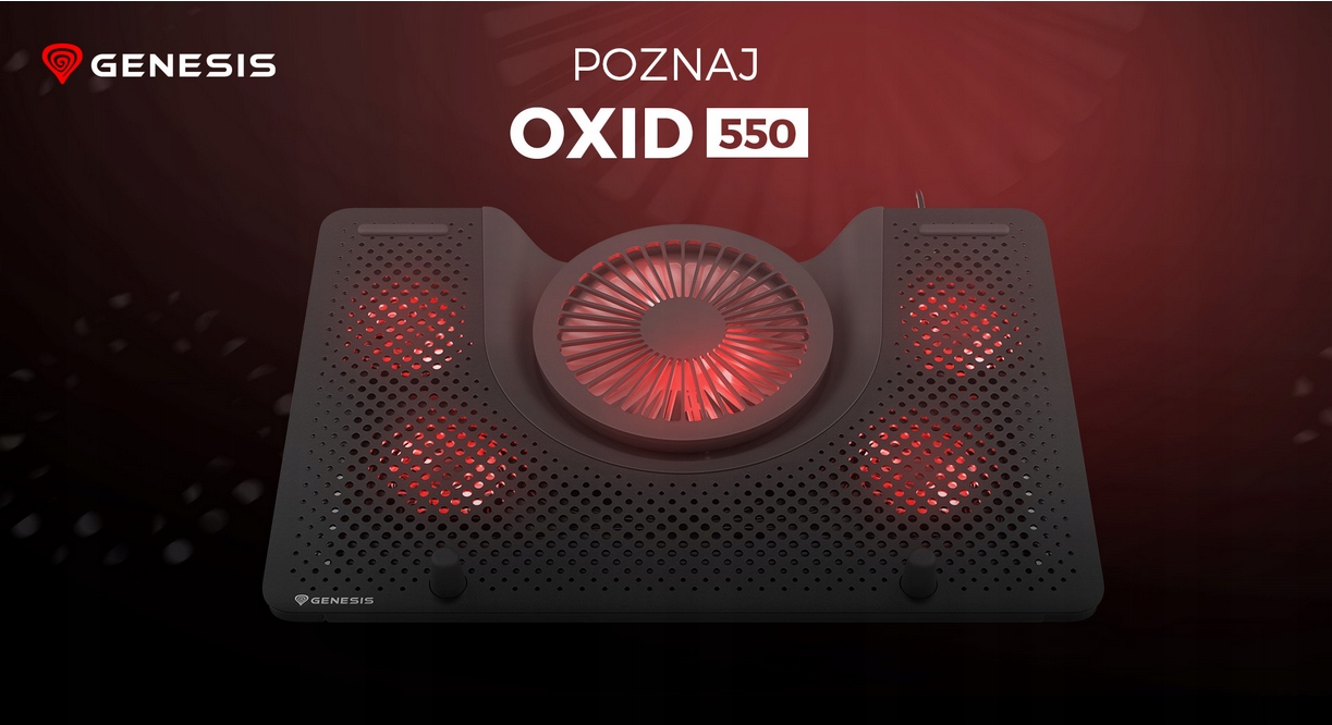 Genesis Oxid 550 — підставка з великою поверхнею охолодження, виготовлена з високоякісного алюмінію, що додатково сприяє правильному розподілу нагрітого повітря. Його конструкція забезпечує відмінне охолодження як великих 17,3-дюймових ноутбуків, так і менших.