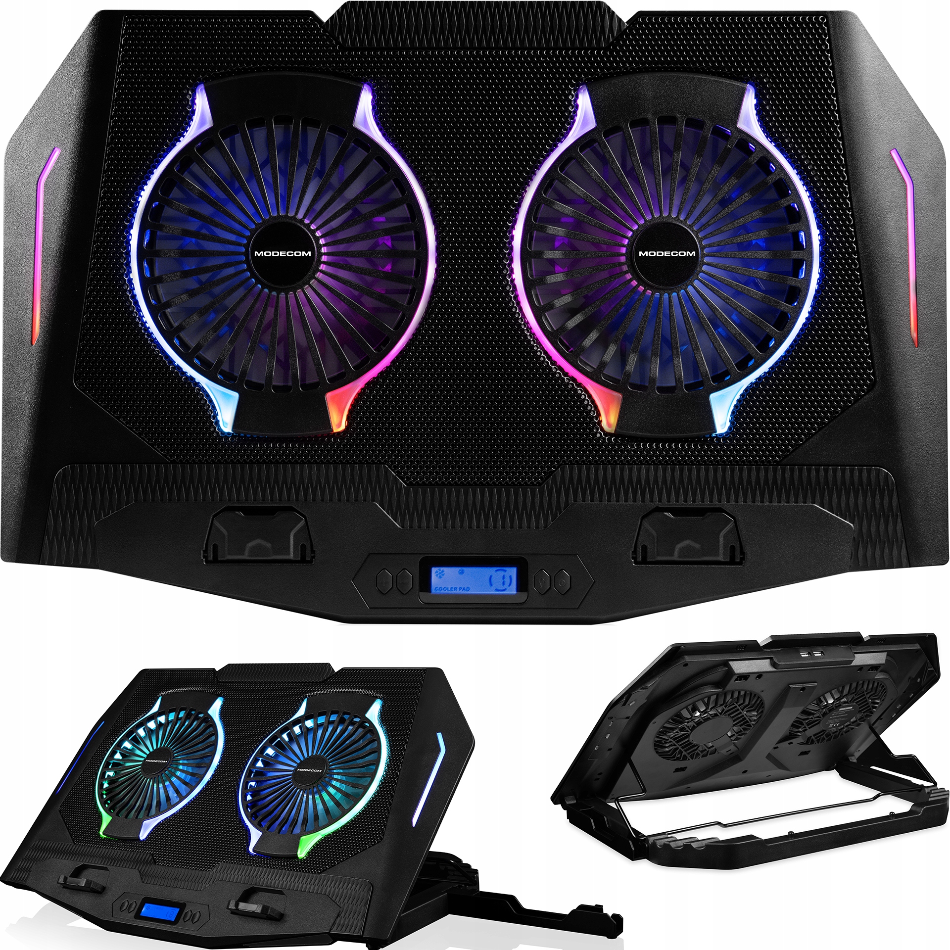 це дуже ефективна охолоджувальна підставка, яка оснащена двома великими вентиляторами діаметром 125 мм з підсвічуванням RGB і потоком повітря 120 CFM . Це одне з найефективніших рішень серед охолоджуючих панелей для ігрових ноутбуків. Панель MODECOM MC-CF21 призначена для ноутбуків з діагоналлю до 18 дюймів в нових дизайнах. РК-дисплей дозволить легко вибрати потрібний режим охолодження, починаючи від самого тихого варіанту і закінчуючи найефективнішим. Завдяки сучасній формі в поєднанні зі світлодіодами RGB підставка ідеально впишеться в більшість ігрових екосистем.