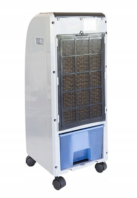 - Він має вбудований контейнер для прохолодної води та кубиків льоду, що підвищує ефективність вентилятора. Випаровування відбувається на спеціальній спеціально розробленій панелі з губки, яка постійно насичена водою. Випаровування води знижує температуру панелі, що призводить до зниження температури повітря, що проходить через панель. Охолоджене повітря знижує температуру в приміщенні, де встановлено кондиціонер.