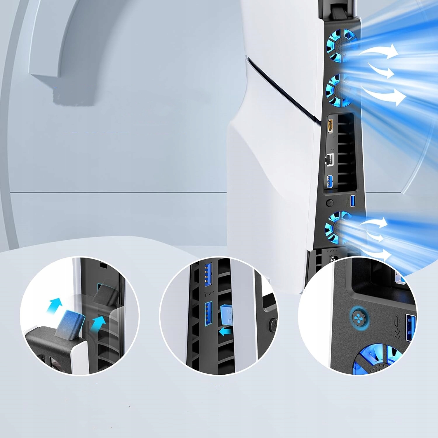 Вентилятор охолодження PS5 Slim має три вбудовані вентилятори з синім світлодіодним індикатором, , які покращують враження GR