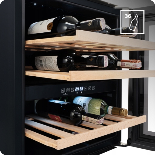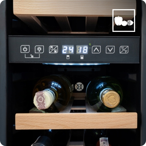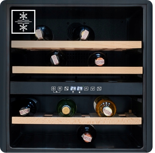 Дві незалежні зони охолодження дозволяють встановити різну температуру для кожної з них. Завдяки цьому ми можемо зберігати різні види вина в одному пристрої.