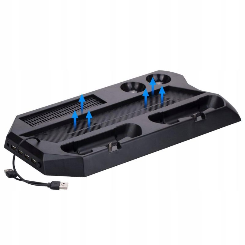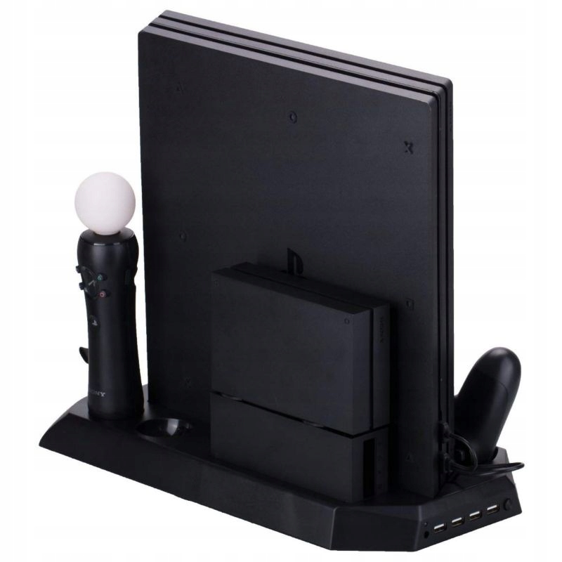 Підставка дозволяє розмістити консолі PlayStation 4 PRO і PlayStation VR на бічній стінці. Це економить місце. Підставка виготовлена ​​з міцного пластику, тому може використовуватися роками. Підставка оснащена 2 вентиляторами для охолодження консолі. Під підставкою є гумки для стабілізації консолі. Станція включає 2 доки для планшетів і 2 доки для контролерів MOVE для їх зарядки. Додатково він оснащений 4 портами USB. Вимикач вентилятора в підставці. Товар абсолютно новий.
