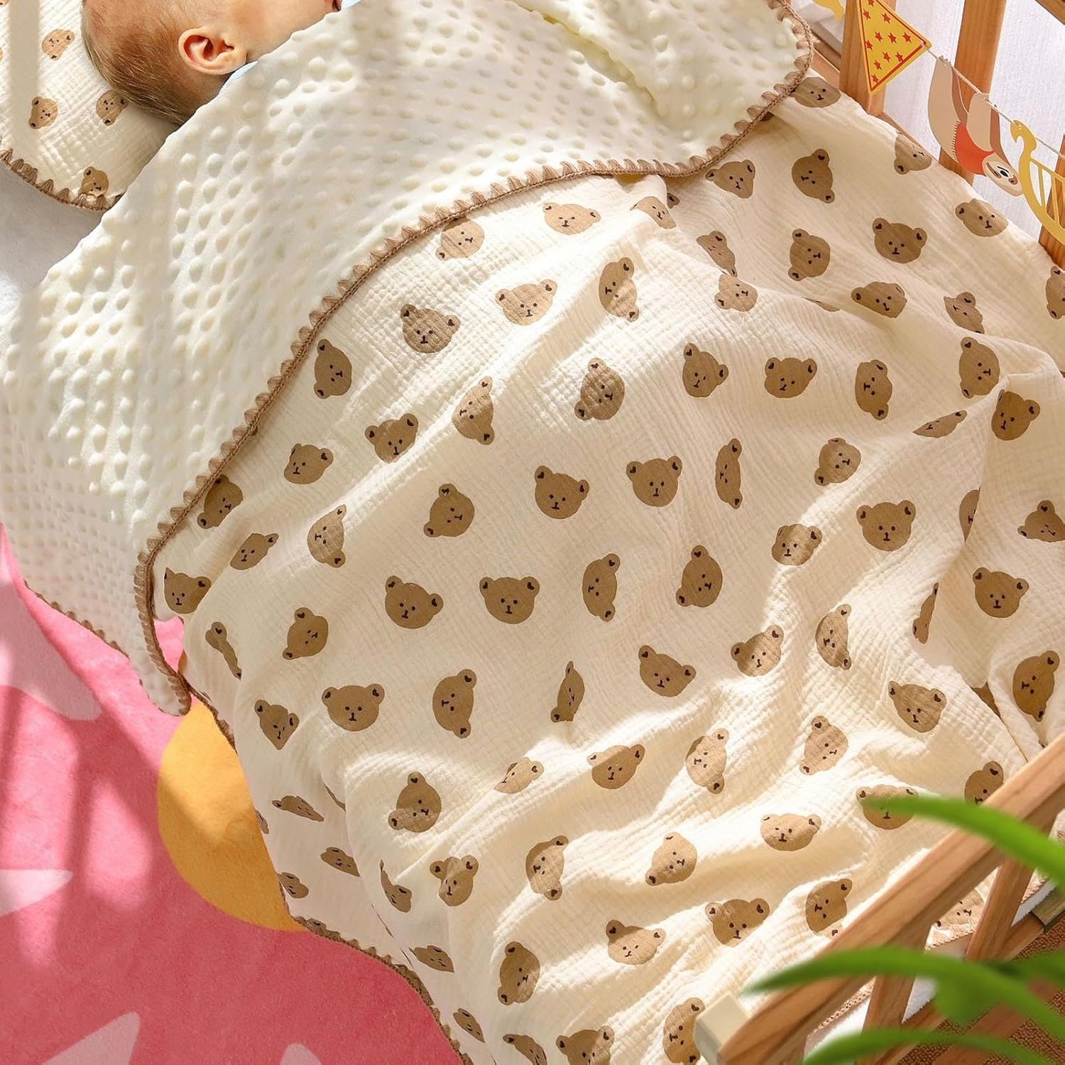 Про цей продукт [Легкий і дихаючий]: чарівна дитяча ковдра виготовлена з бавовняної креп-пряжі та плюшу в горошок, у якому вашій дитині буде прохолодно та комфортно навіть спекотними літніми ночами. [Симпатичний візерунок у крапки]: м’яка дитяча ковдра має милі візерунки в крапки, які додадуть нотку веселощів сну вашої дитини, зроблять його більш приємним і привабливим. [Багатофункціональний]: Дитячу охолоджуючу ковдру можна використовувати як заспокійливе сповивання, ковдру для дитячої кімнати або кімнатну ковдру, задовольняючи різні потреби та забезпечуючи комфорт у різних ситуаціях. [М’який і зручний]: м’яка текстура дихаючої ковдри дає вашій дитині відчуття безпеки, допомагаючи їй спокійно заснути та позбавляючи від тривоги. [Вишукане виконання]: Дитяча ковдра в горошок створена з особливою увагою до деталей і міцних матеріалів для довговічності.