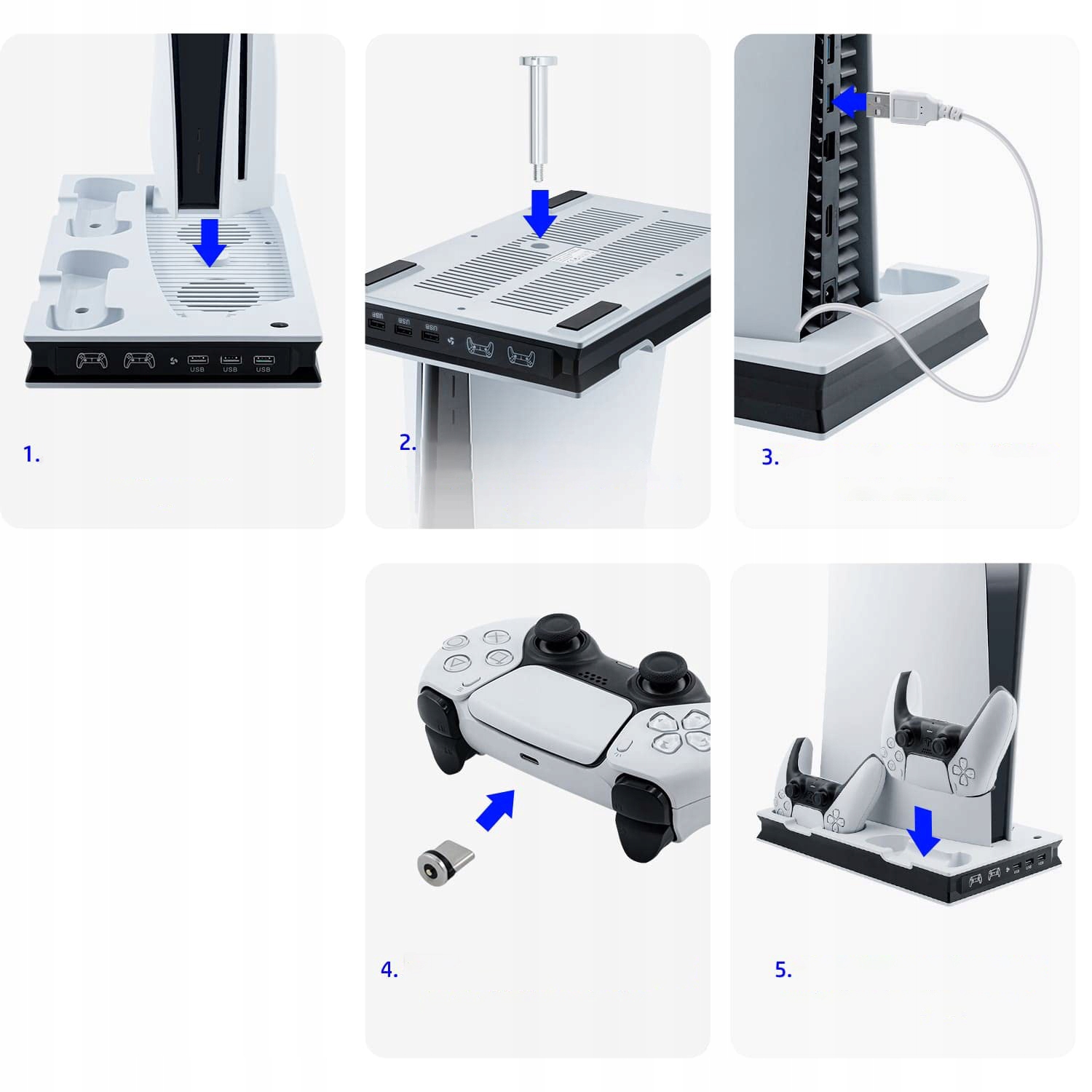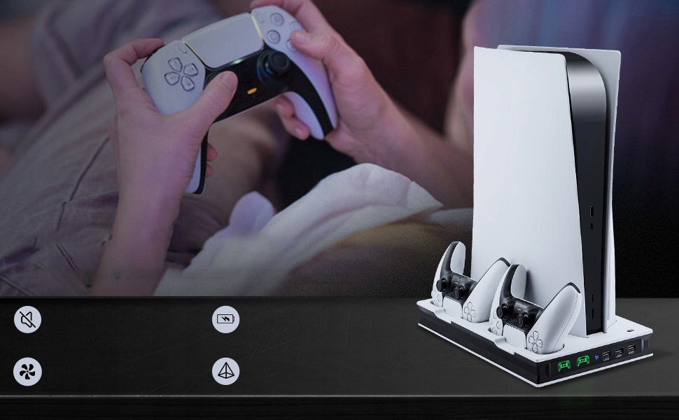4. І 3 додаткові порти USB дозволяють заряджати різні пристрої, такі як миша, клавіатура, набір навушників тощо. Завдяки елегантному та акуратному дизайну, ця підставка PS5 з вентилятором охолодження та контролером для контролера дозволяє підтримувати та організовувати аксесуари PS5 разом. Необхідні аксесуари для PlayStation 5 для вас!
