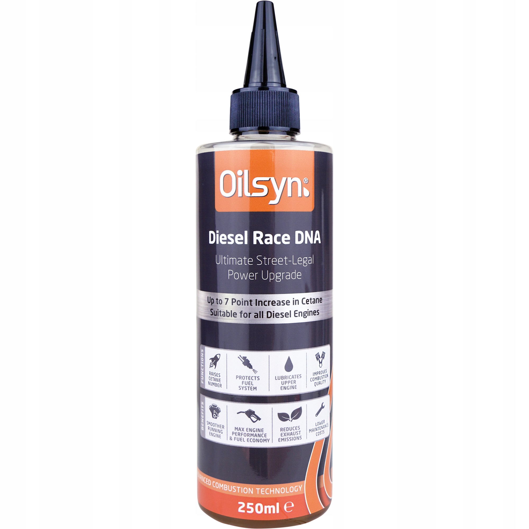 Diesel Race DNA – це унікальний концентрат, який перетворює звичайне дизельне паливо на високоякісне гоночне дизельне паливо. , безпечно максимізуючи доступну потужність двигуна завдяки поєднанню оптимальної дози цетанової присадки, високої дози запатентованої складноефірної оливи та потужного каталізатора згоряння. Унікальна мастило-модифікатор тертя на основі ефіру Oilsyn Orisyn перевершує звичайні мастильні присадки для дизельного палива, захищає насос високого тиску, форсунки та пару поршень/циліндр, додатково знижуючи тертя, що позитивно впливає на згоряння та шум двигуна. дизельного двигуна.