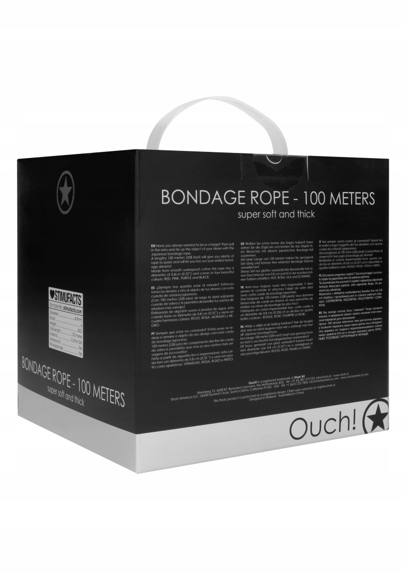 Почніть смикати за ниточки за допомогою цієї японської мотузки для партнерів. Ця 100-метрова мотузка дозволить вам втілити ваші найсміливіші фантазії про кабалу. Це дійсно довго, ви не повинні його пропустити. Виготовлена з ніжної водонепроникної бавовни, мотузка має діаметр 0,8 см і продається в чотирьох чудових кольорах: ЧЕРВОНОМУ, РОЖЕВОМУ, ФІОЛЕТОВОМУ ТА ЧОРНОМУ.