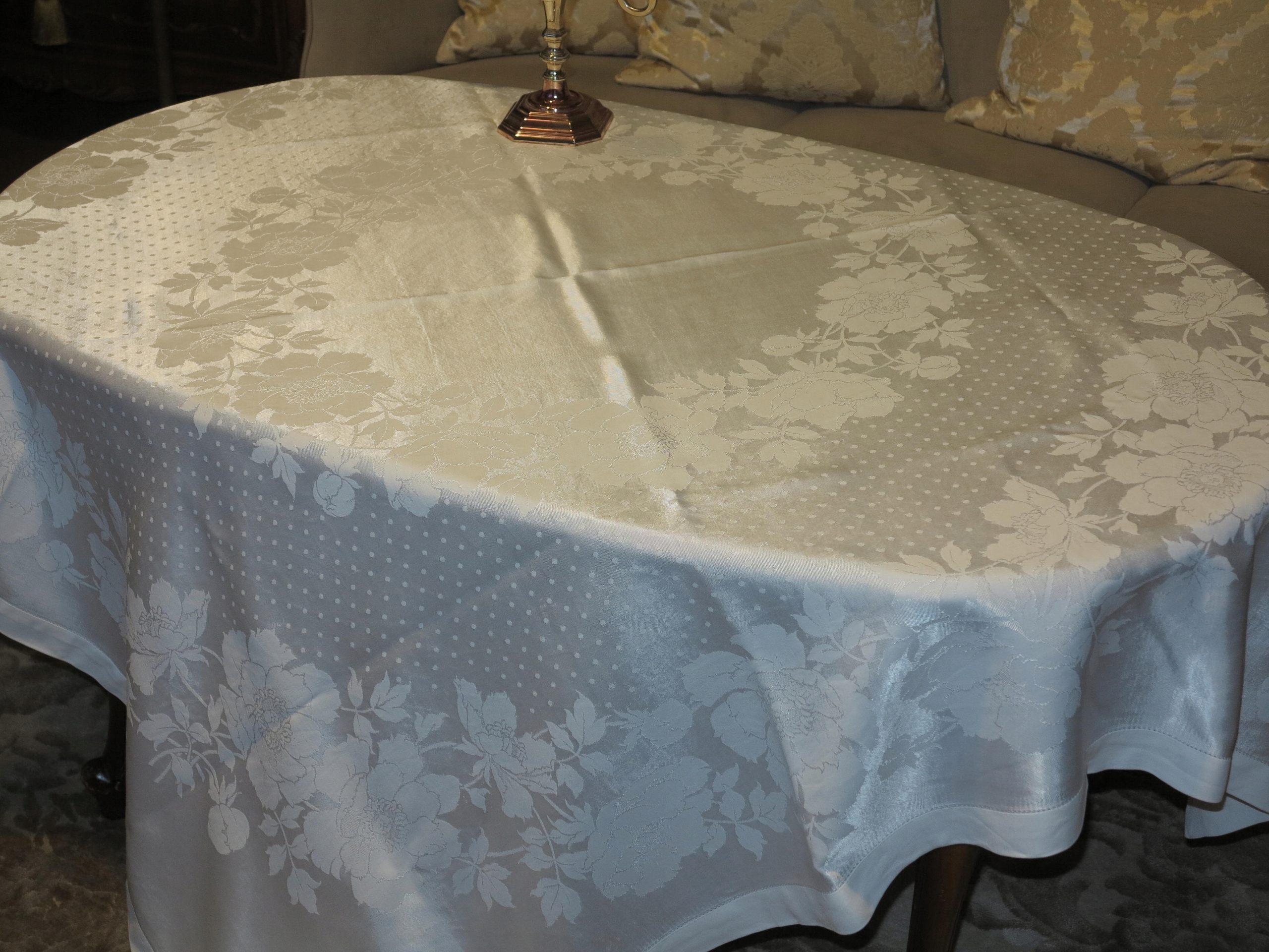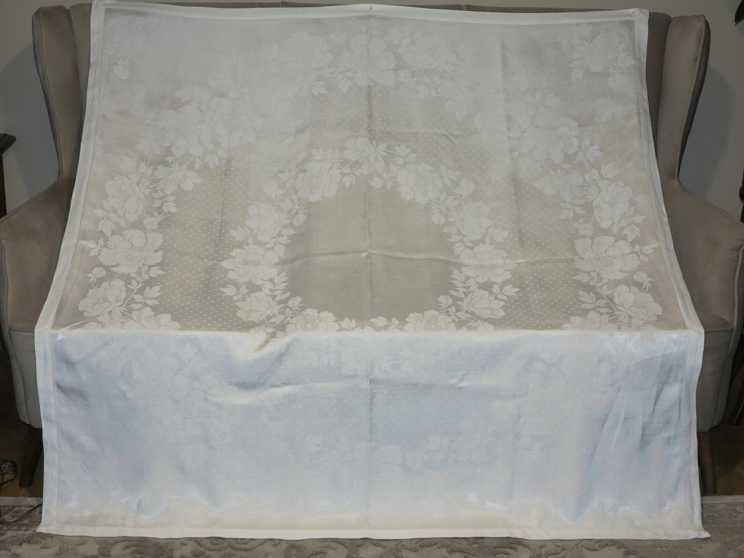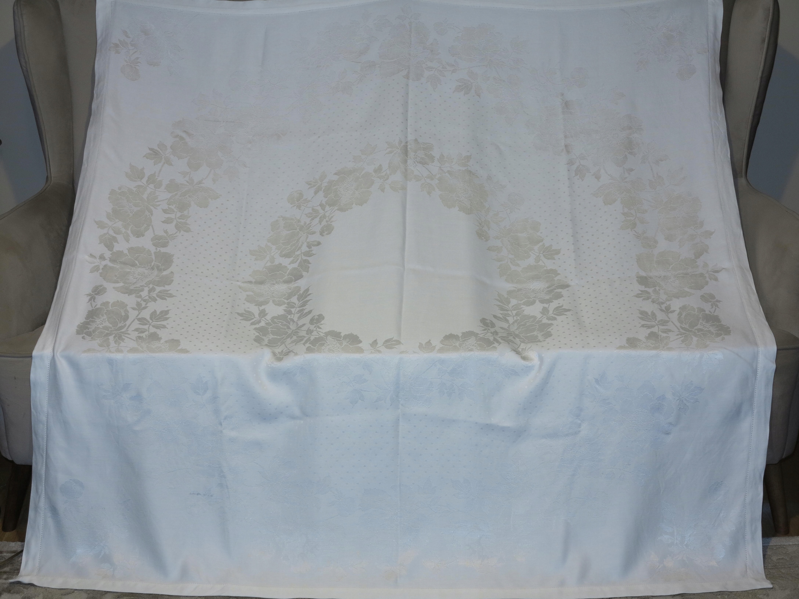 На аукціоні продається надзвичайно красива дамаська скатертина з візерунками троянд. Скатертина має розміри: довжина 154 см, ширина 151 см. Скатертина б/у, в чудовому стані. Рекомендую, буде гарною прикрасою столу. Рекомендую.