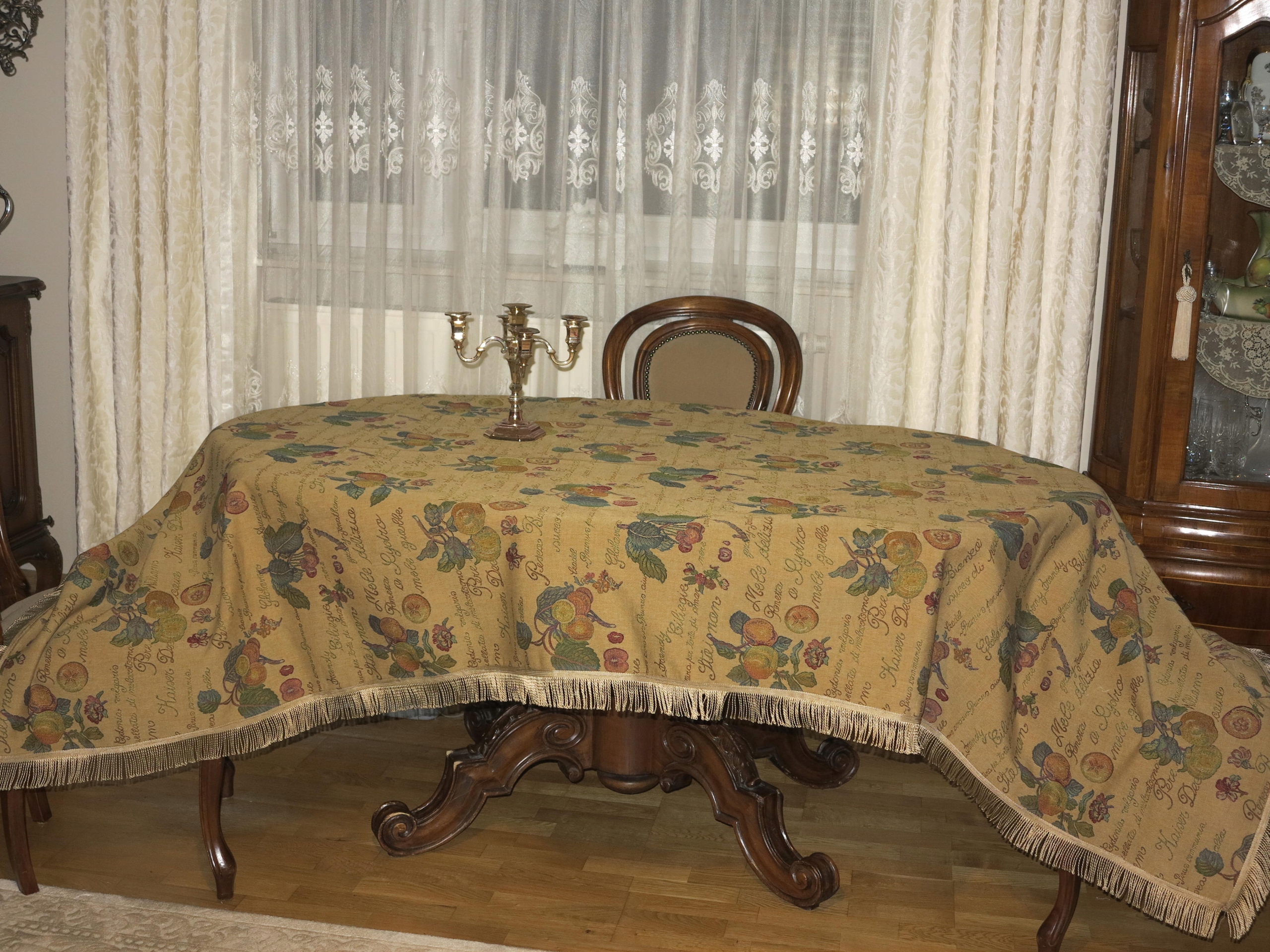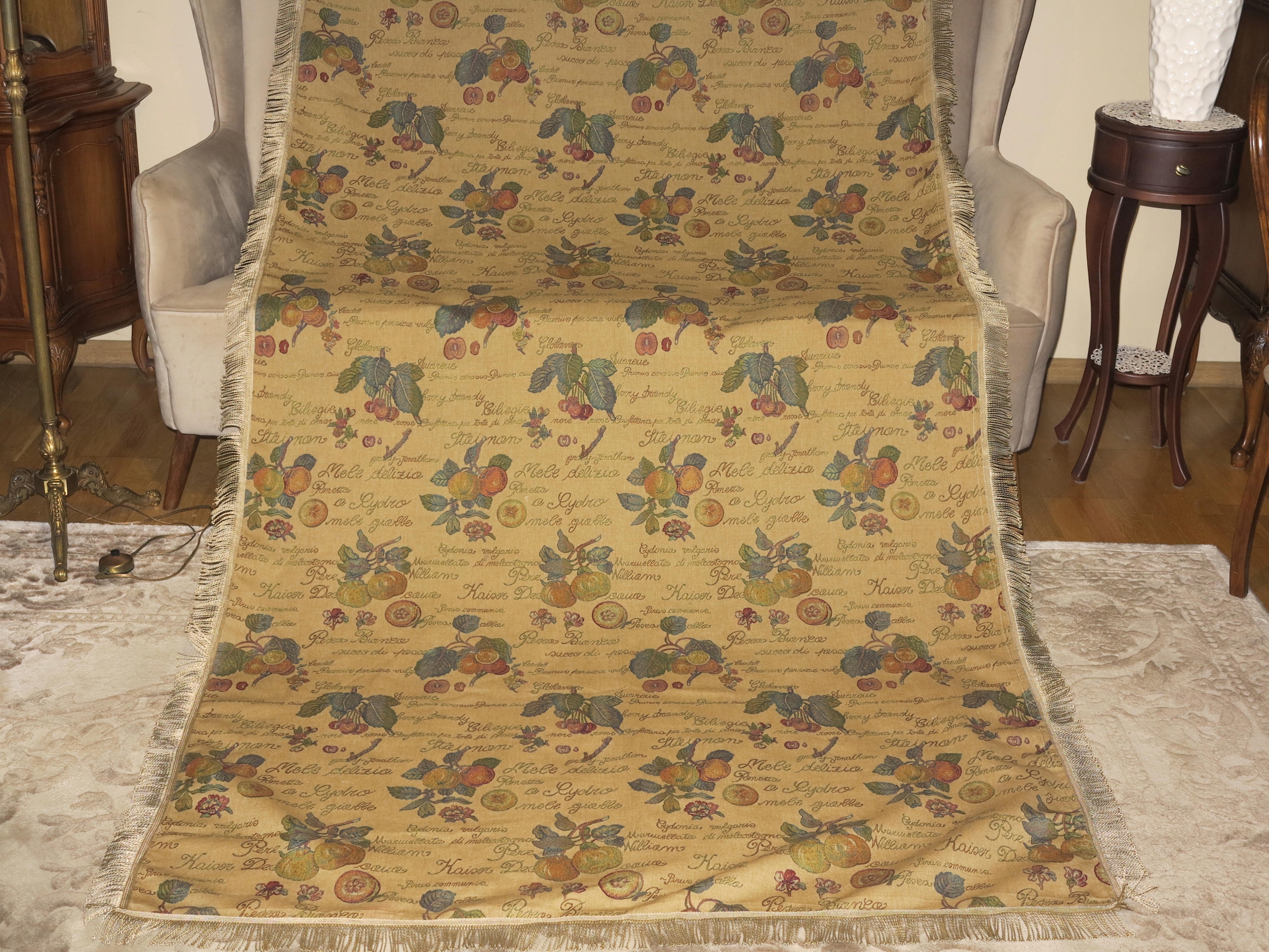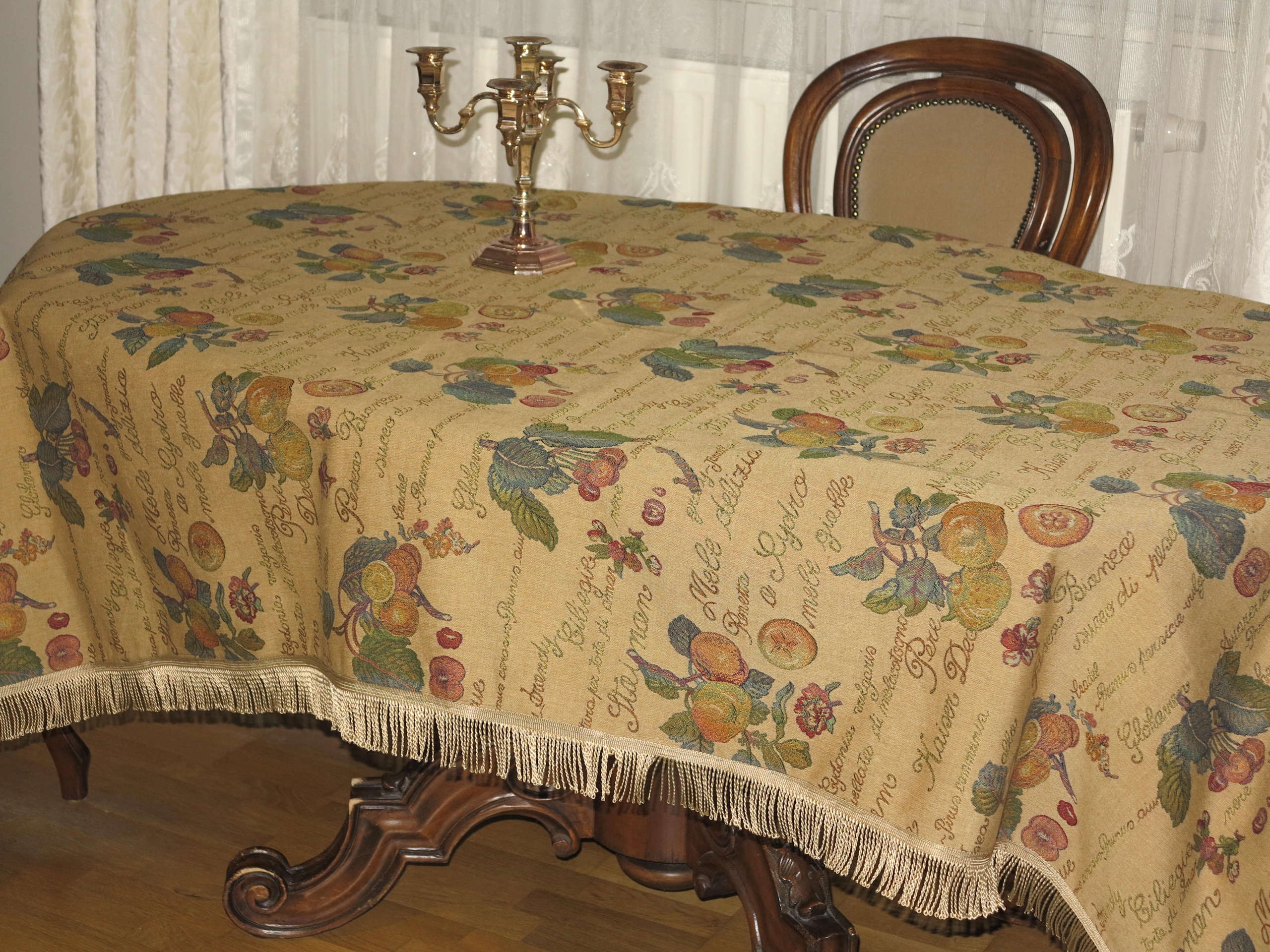 зразок- надзвичайно красива стильна скатертина, виготовлена з густого бавовняного клопа, фруктів та написів. Про Golden ourtes