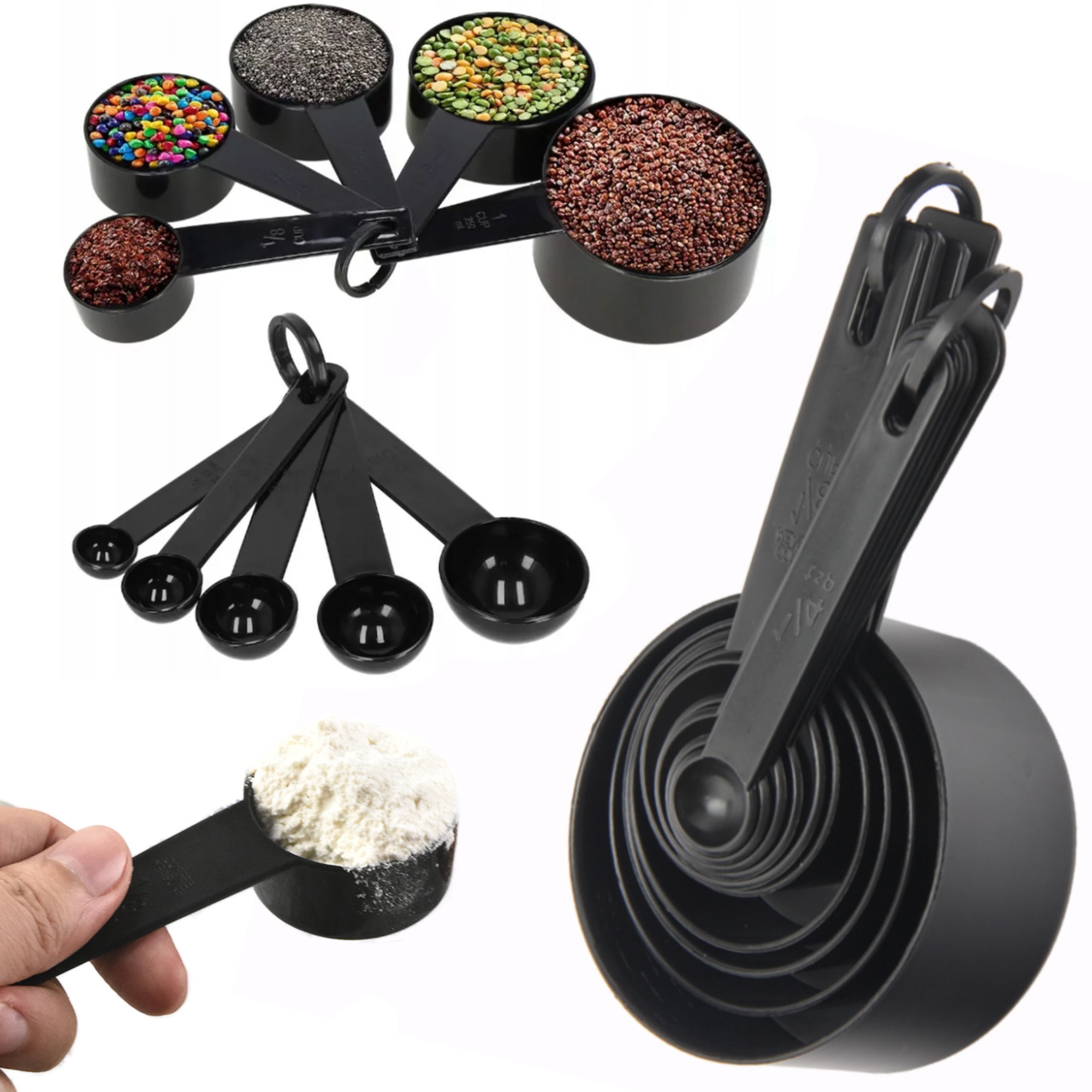 Кухонні мірні стакани - це практичний набір, що складається з десяти елементів. Виготовлені з міцного пластикувитонченого чорного кольору. У набір входять мірні чашки як для чайних ложок, так і для склянок.