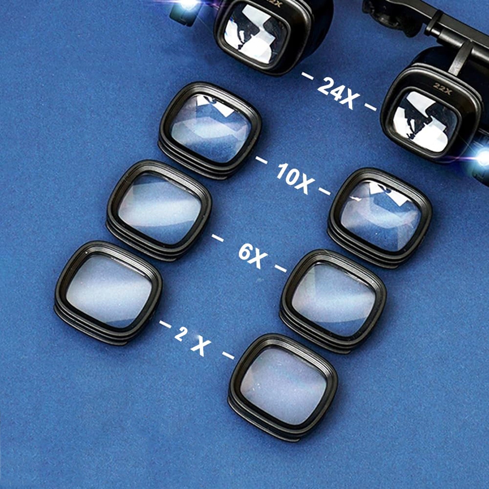 👓👓 [Змінні збільшувальні лінзи] Оснащені 4 наборами змінних лінз (2X, 6X, 10X, 24X), ці збільшувальні окуляри відповідають вашим різноманітним потребам у збільшенні. Ідеально підходить для ідентифікації ювелірних виробів, ремонту годинників і читання. Лінзи швидко й легко замінити, їх можна зберігати у футлярі для зберігання, що входить у комплект, що робить їх ідеальними для точної роботи чи повсякденного використання.