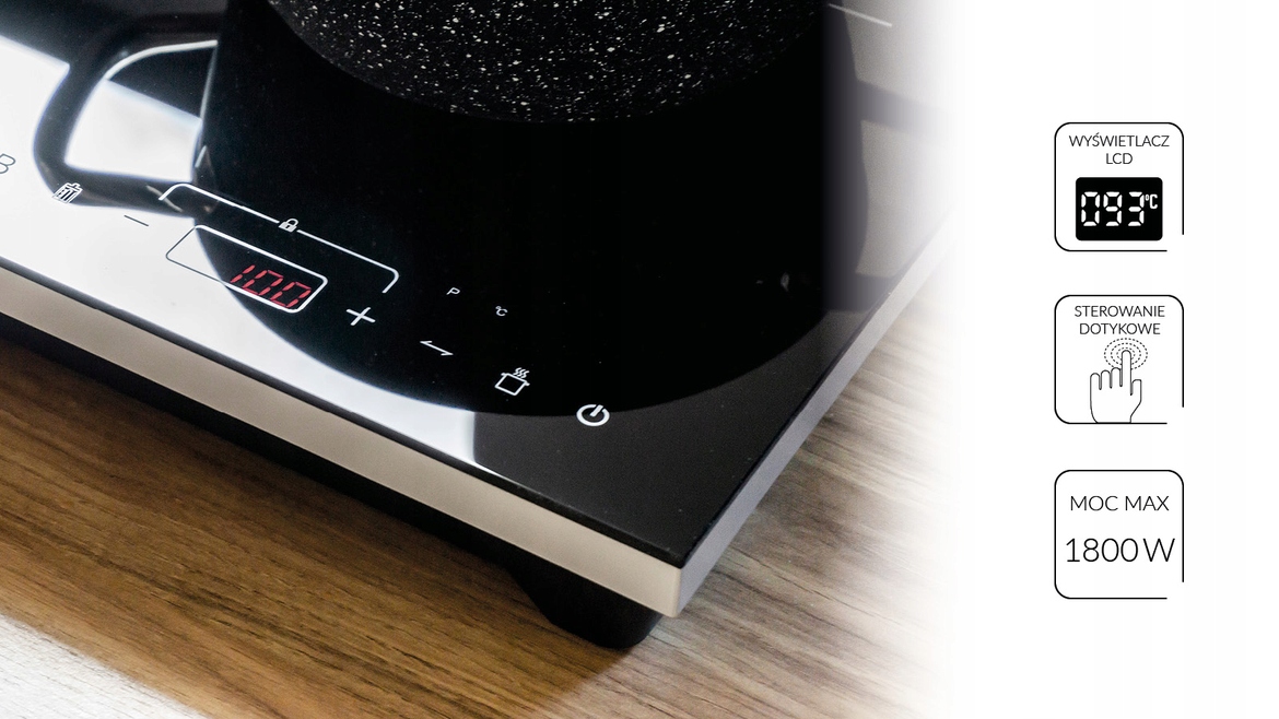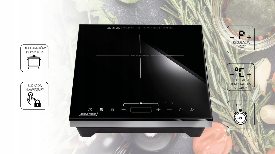 Однополюсна індукційна плита MKE-14 має сенсорну функціональну панель зі світлодіодним дисплеєм. Панель має зрозумілий та інтуїтивно зрозумілий дизайн, її робота не вимагає складної послідовності команд. Панель оснащена можливістю блокування, налаштуваннями температури в діапазоні 60-240 ° C і індикатором потужності з регулюванням. Завдяки вбудованому таймеру ми також можемо точно запрограмувати час приготування.