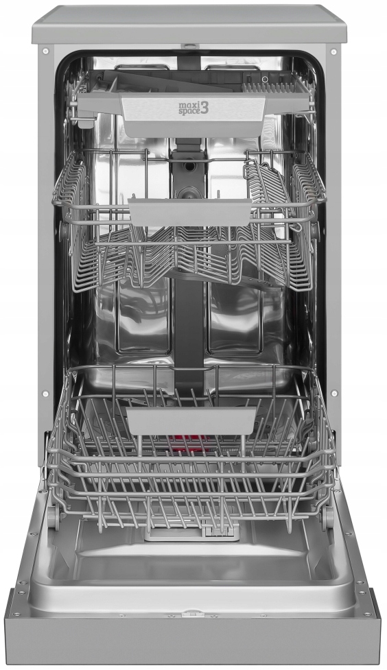 Окремо стояча посудомийна машина, ширина 45 см, срібляста. 7 програм, половинне завантаження, відкладений старт, 3 корзини.
