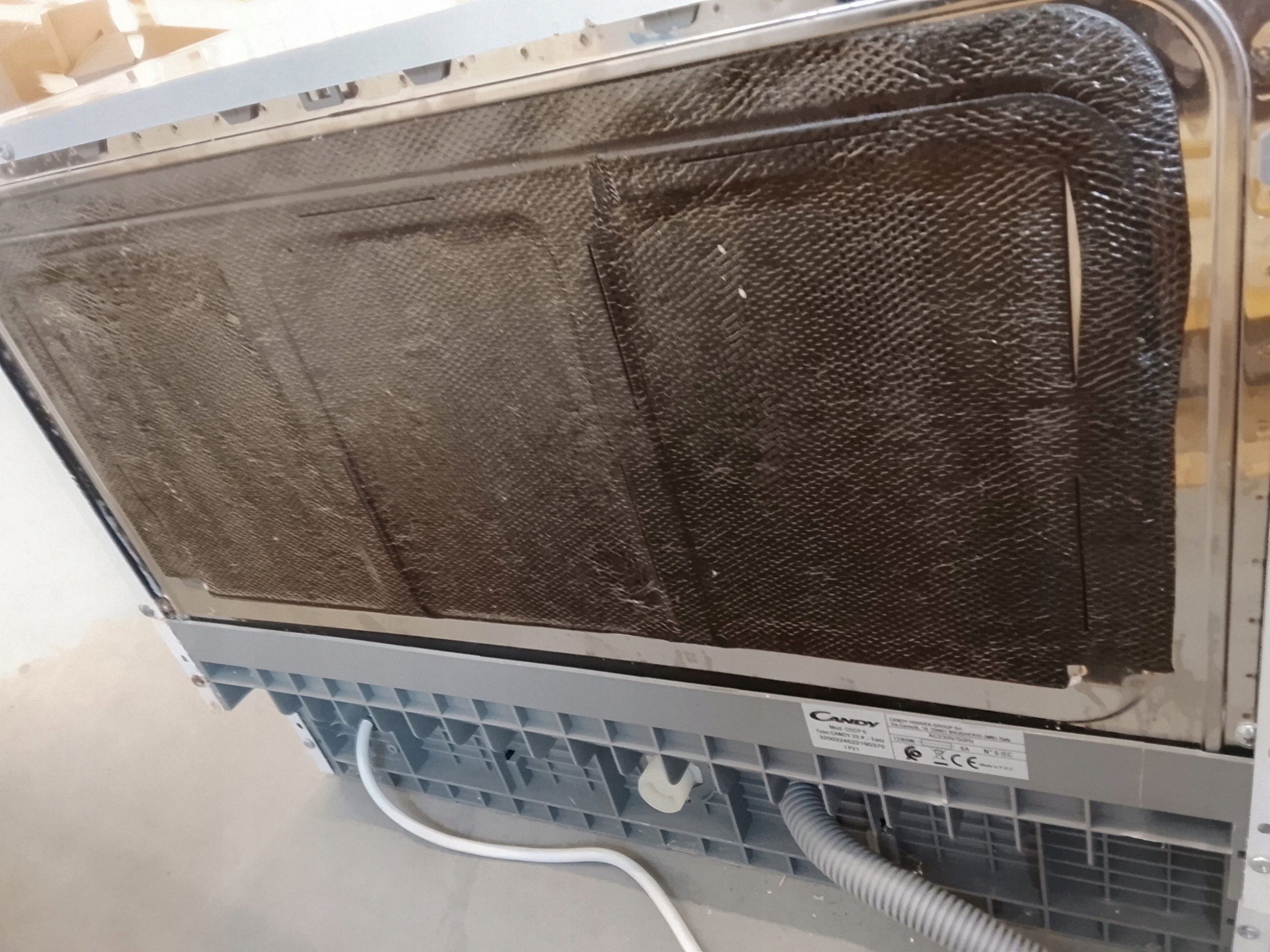 Дуже зношена посудомийна машина, розрахована на запчастини. Видно численні подряпини, бруд та сліди іржі; вода/сіль для посудомийної машини/залишки миючого засобу; Накладка на дверях відклеюється, двері не закриваються через відсутність засувки, написи на панелі управління стерті.