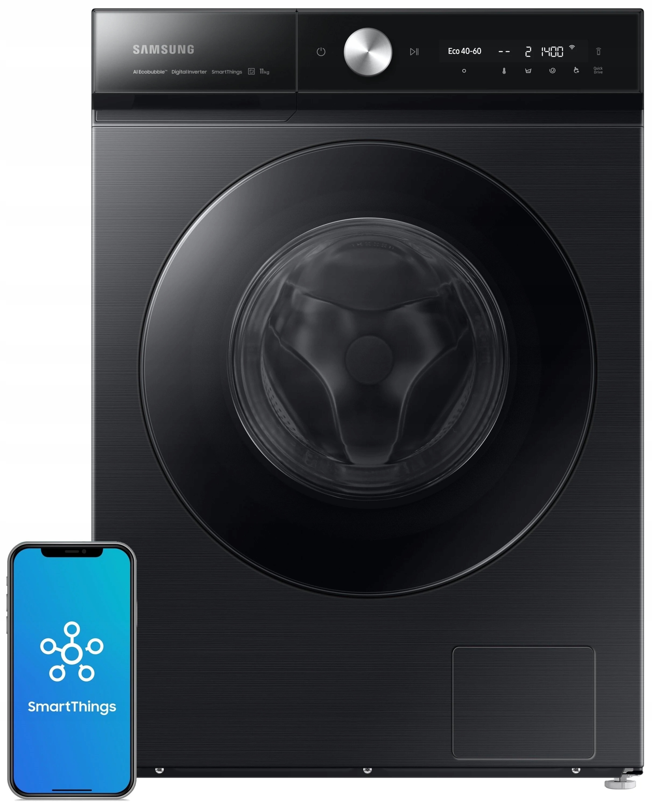 Панель керування штучним інтелектом дозволяє регулювати параметри пральної машини відповідно до ваших потреб і вподобань. Він запам’ятовує, як ви використовуєте пральну машину, і пропонує відповідні програми, а також на основі процесу прання пропонує відповідний цикл сушіння в сушильній машині, підключеній до пральної машини. Пристрій простий у використанні, також завдяки додатку SmartThings. Відстежуйте час, що залишився до кінця прання, або перевіряйте вирішення проблем, де б ви не були.
