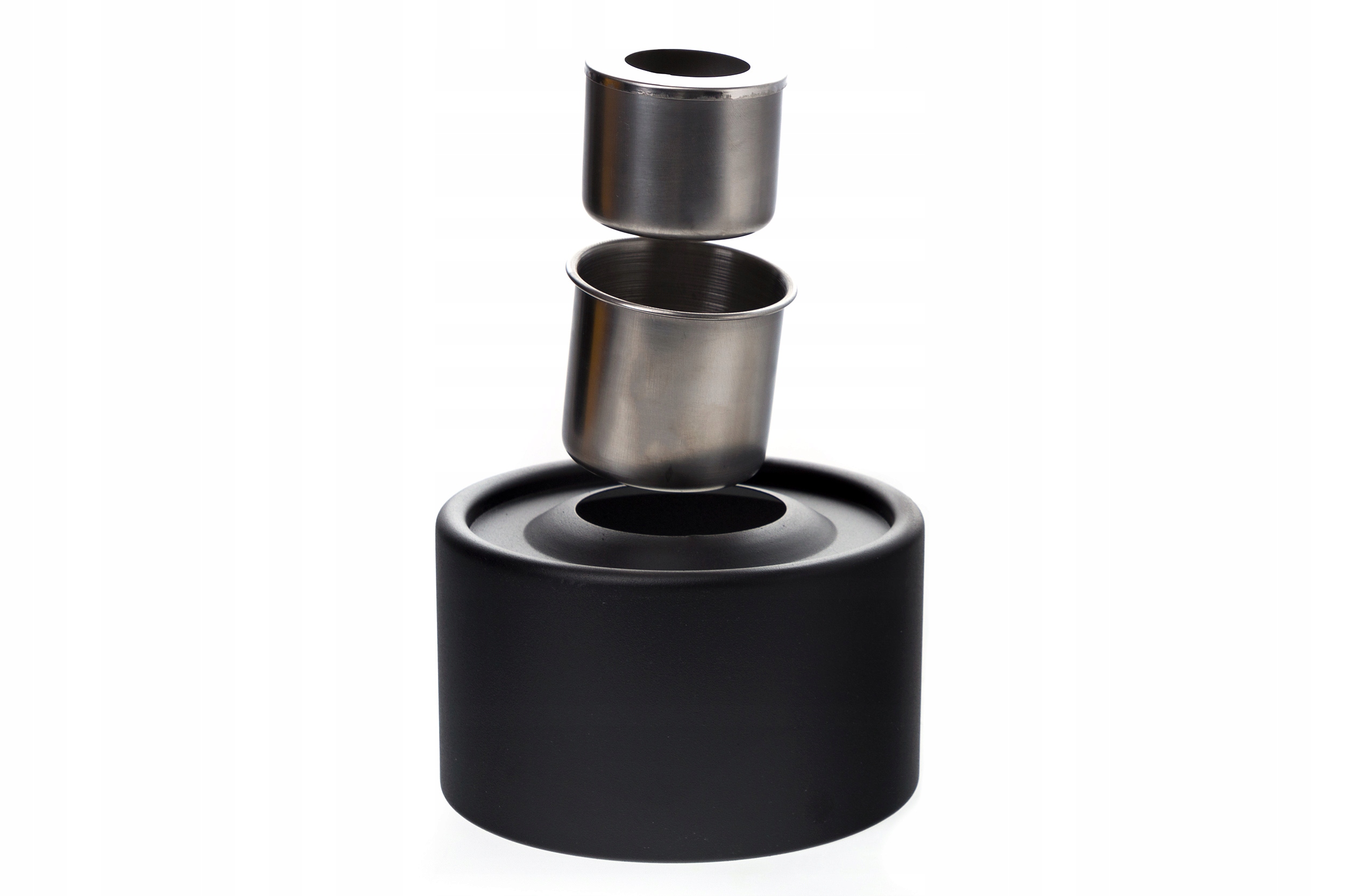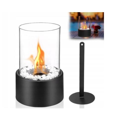 Цей елегантний настільний камін має елегантну чорну металеву основу, знімне циліндричне скло, камеру згоряння з нержавіючої сталі та свічник. У ньому можна спалити не тільки алкоголь, а й чайні вогники та свічки. Він повністю без вентиляції, його легко встановити та використовувати одразу після вилучення.