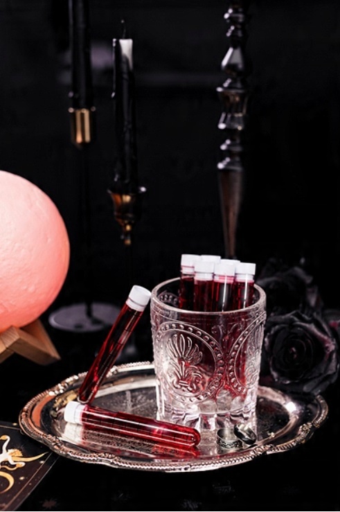 - Рекомендуємо налити в них малиновий сік, червоне вино або настоянку, вони будуть схожі на пробірки з кров’ю