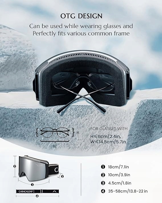 Магнітний механізм швидкої зміни та дизайн OTG: у наших зимових окулярах використовується технологія магнітного блокування лінз із 8 потужними магнітами для надійного кріплення лінз. Додаткові замки з обох сторін запобігають випаданню лінз. Завдяки дизайну OTG їх зручно носити поверх окулярів (оправа < 5,7" < 2,4"). Наші лижні окуляри OTG забезпечують комфорт і ефективність, щоб ви могли повністю насолоджуватися катанням