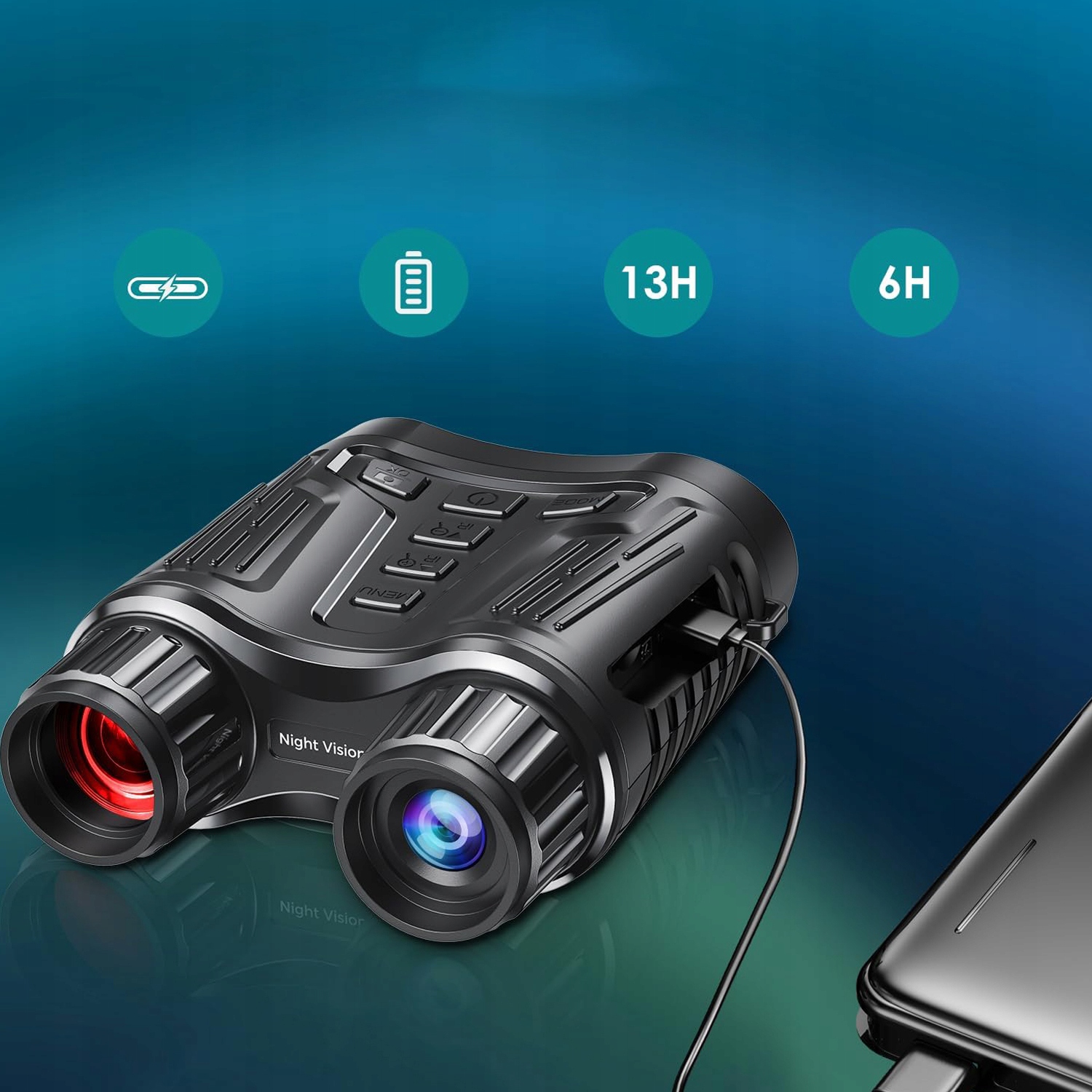 Інфрачервоні прилади нічного бачення мають вбудований акумулятор на 2600 мАг. Вони витримують до 6 годин роботи з увімкненим інфрачервоним портом і 13 годин з вимкненим. Заряджання типу C Порт сумісний із більшістю акумуляторів живлення, тож ви можете живити його в дорозі та звільнити руки від носіння акумуляторів.