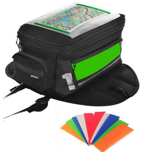 Універсальна сумка-бак місткістю 35 літрів, розширена на блискавці. Фіксується сильними магнітами. Має велику головну кишеню та практичні бічні кишені. У верхній частині вбудований тримач карти. Розстібнувши сумку, ви можете використовувати основу, яка одночасно є тримачем карти. У набір входить водонепроникний чохол, який ідеально захищає від дощу, зручний плечовий ремінь, який полегшує перенесення, якщо його зняти з мотоцикла, і п'ять кольорових вставок, які, вставивши їх у прозоре бічне вікно, допомагають підібрати сумку до кольору. мотоцикл. Вставте кольори: зелений, оранжевий, червоний, срібний, синій.