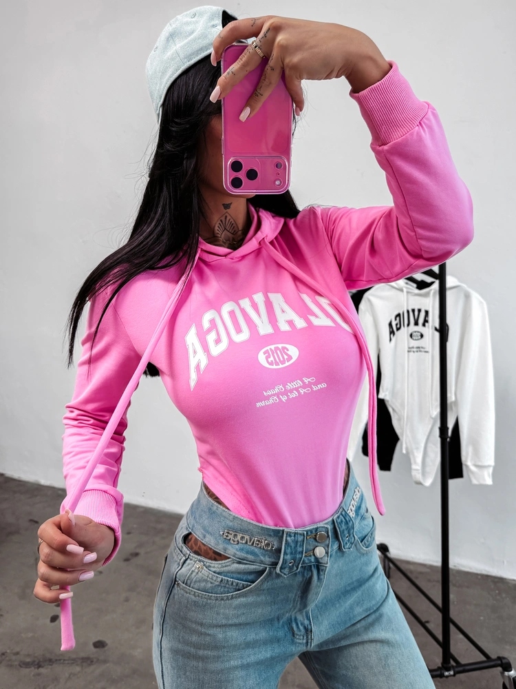 Повсякденне боді з довгими рукавами та капюшоном. Виготовлений з високоякісного гнучкого матеріалу. Манжети в рубчик. Лицьову частину прикрашає розлогий логотип OLAVOGA, доповнений мінімалістичними написами, які привертають увагу та надають стилю виразності.