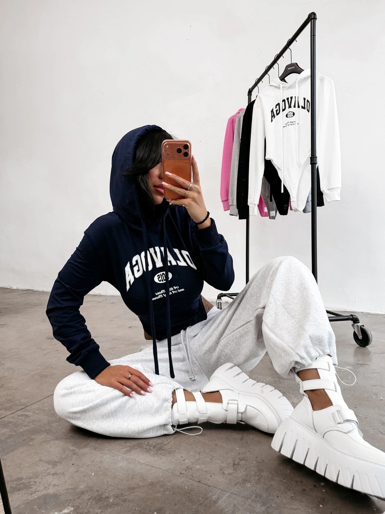 Повсякденне боді з довгими рукавами та капюшоном. Виготовлений з високоякісного гнучкого матеріалу. Манжети в рубчик. Лицьову частину прикрашає розлогий логотип OLAVOGA, доповнений мінімалістичними написами, які привертають увагу та надають стилю виразності.