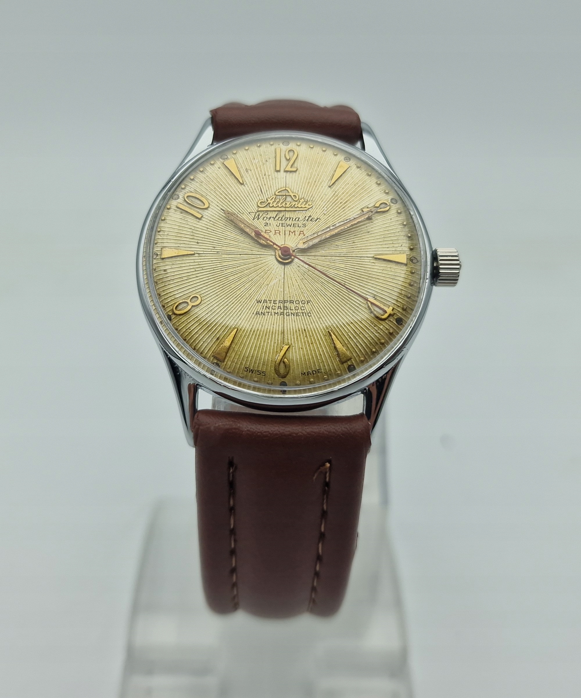 - Сріблястий металевий циферблат із золотими годинниковими мітками та красивим сяючим гільошуванням. Оригінальний циферблат із підписом: «ATLANTIC WORLDMASTER, PRIMA 21 JEWELS, INCABLOC, WATERPROOF, ANTIMAGNETIC, SWISS MADE». Циферблат майже в ідеальному стані.