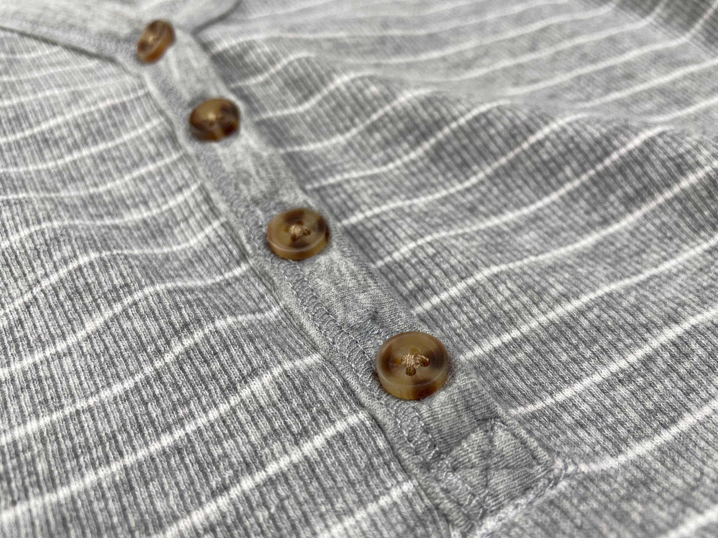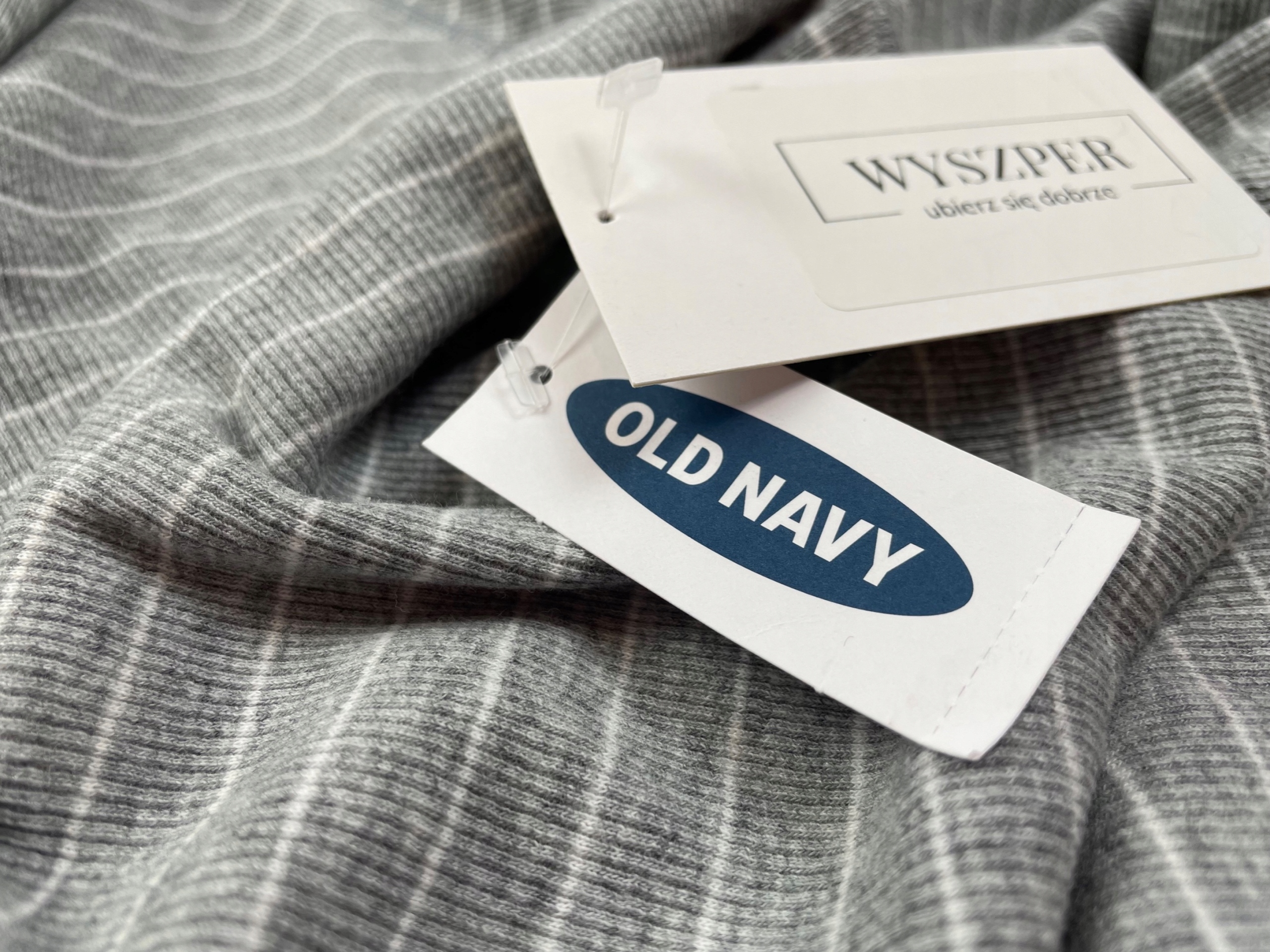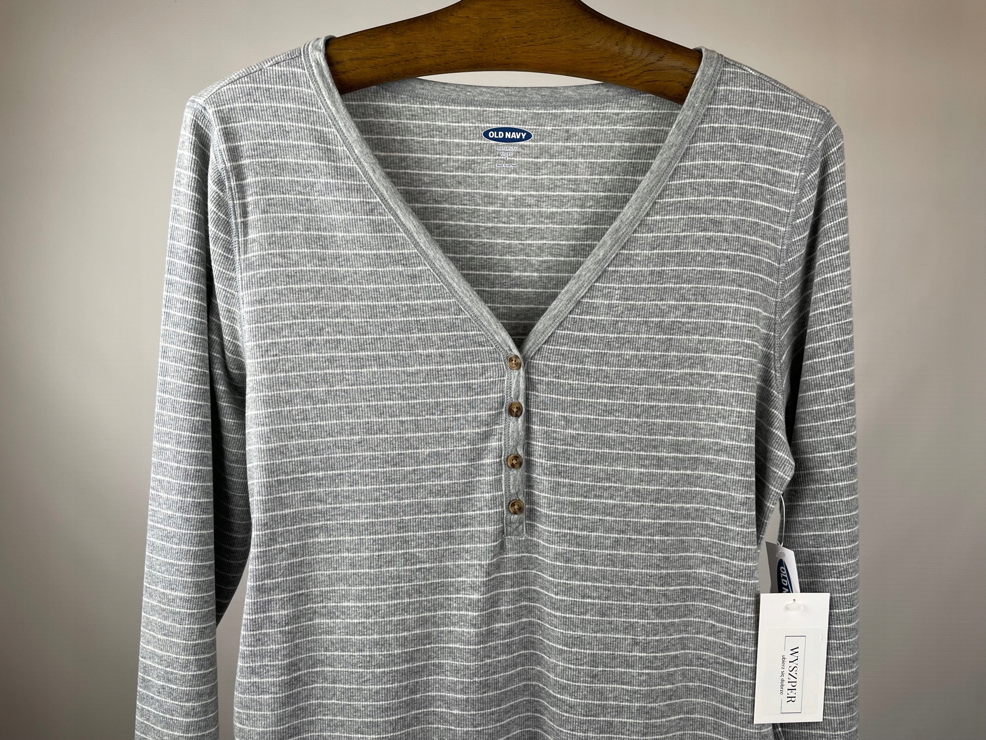 - Жіноча блуза Old Navy, модель Maternity Fitted. Блузка сірого, меланжевого кольору з візерунком з горизонтальних білих смуг. Він має V-подібний виріз і довгі рукави. Блуза виготовлена з приємного на дотик матеріалу з ребристою структурою.