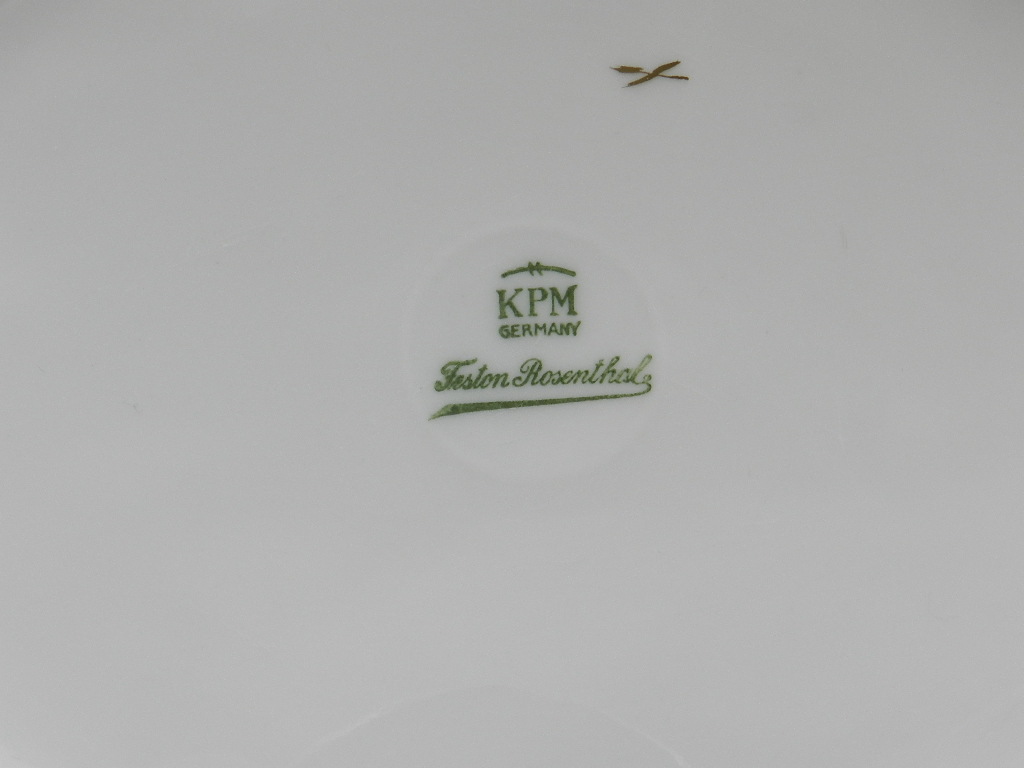 Знак KPM, який використовувався в 1920-1926 роках, і примітка «Feston Rosenthal», яка використовувалася лише на бланках Розенталя. Дуже хороший стан. Всередині терріну є дві невеликі продуктивні мухи. Висота з ручкою 14 см; ширина 30 x 19,5 см.
